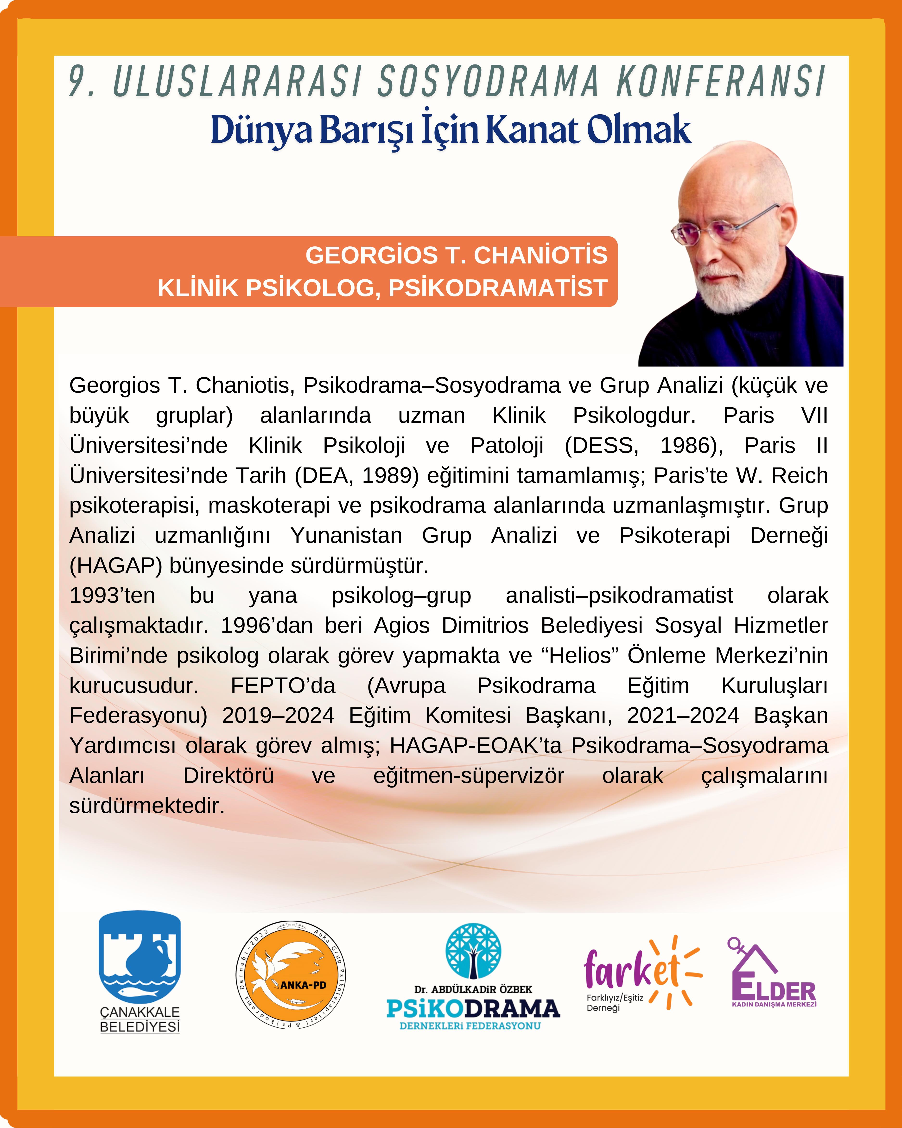 “Dünya Barışı İçin Kanat Olmak” sloganıyla çalışmaları yürütülen 9. Uluslararası Sosyodrama Konferansı öncesinde düzenlenen ön konferans atölyeleri kapsamında, klinik psikolog ve psikodramatist Georgios T. Chaniotis ile yürütülecek “Teucer, Helen, the Messenger, Truth and the Imaginary” başlıklı çalışma, 8 Şubat 2026 Pazar günü 13.00-16.00 saatleri arasında Altın Yıllar Yaşam Merkezi'nde gerçekleşecek.