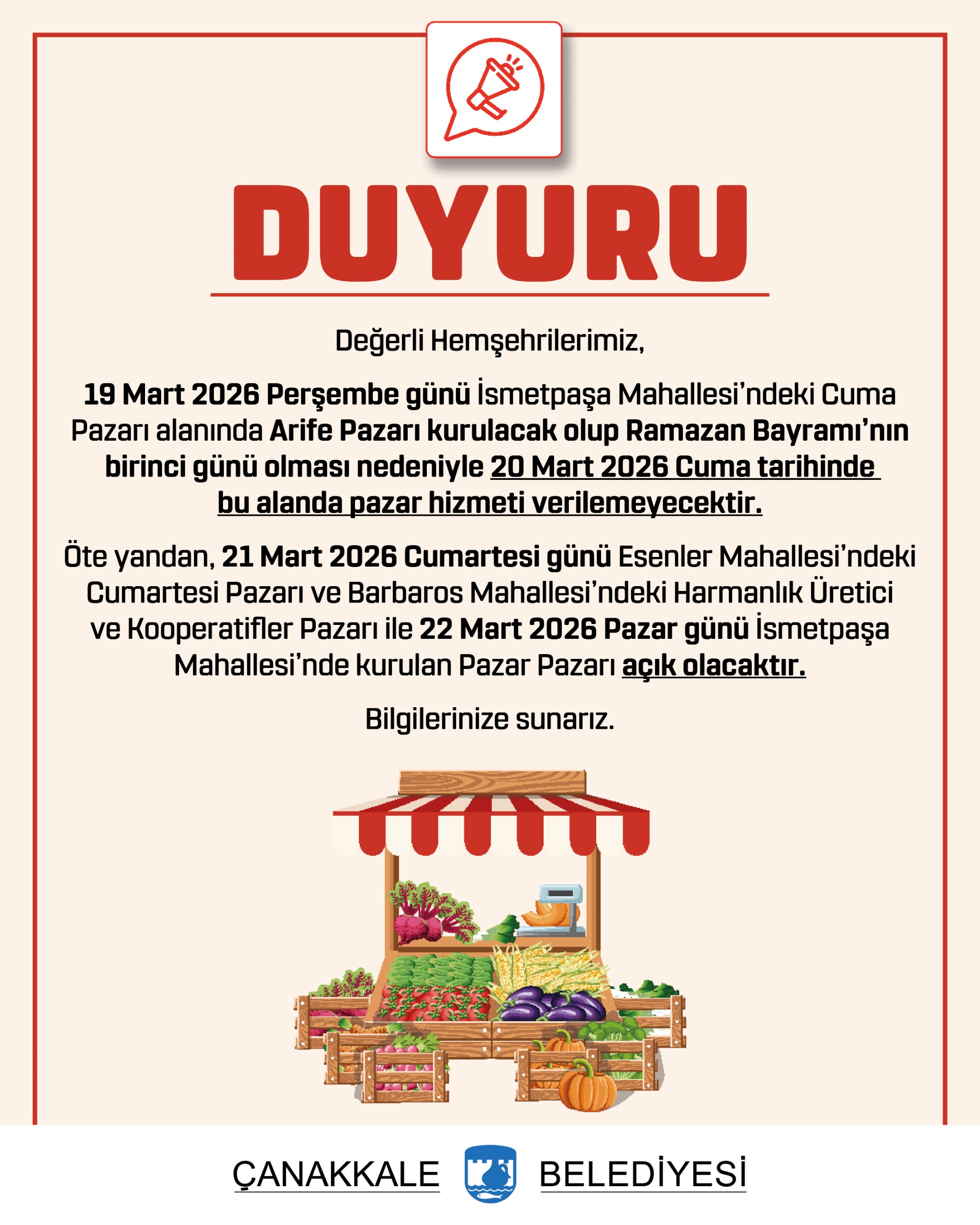 19 Mart 2026 Perşembe günü İsmetpaşa Mahallesi'ndeki Cuma Pazarı alanında Arife Pazarı kurulacak olup Ramazan Bayramı’nın birinci günü olması nedeniyle 20 Mart 2026 Cuma tarihinde bu alanda pazar hizmeti verilemeyecektir.