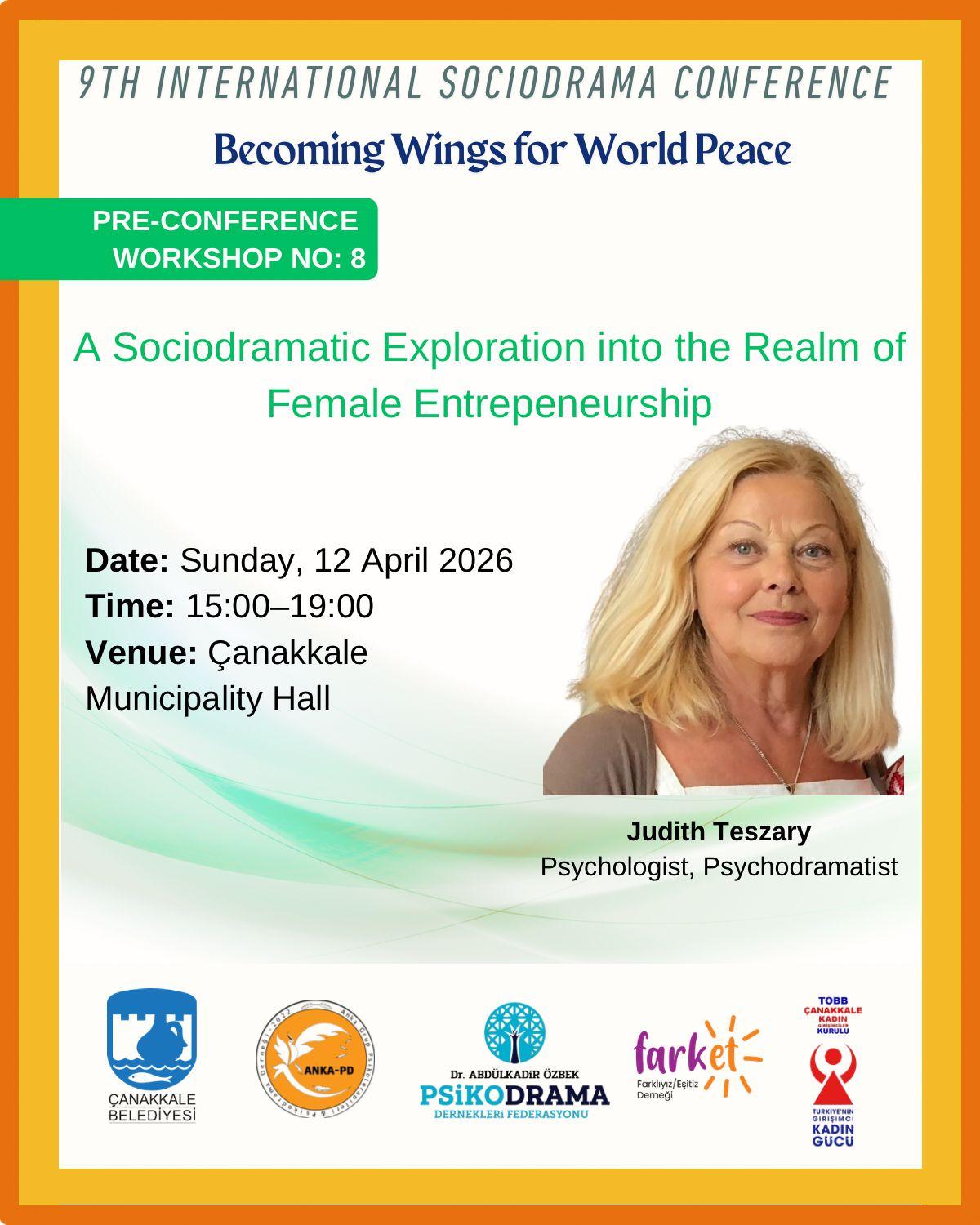 “Dünya Barışı İçin Kanat Olmak” sloganıyla çalışmaları yürütülen 9. Uluslararası Sosyodrama Konferansı öncesinde düzenlenen ön konferans atölyeleri kapsamında, psikolog ve psikodramatist Judith Teszary ile yürütülecek “Kadın Girişimcilik Alanına Sosyodramatik Bir Bakış” başlıklı çalışma, 12 Nisan 2026 Pazar günü 15.00 – 19.00 saatleri arasında Çanakkale Belediyesi Nikah Salonunda gerçekleşecek.