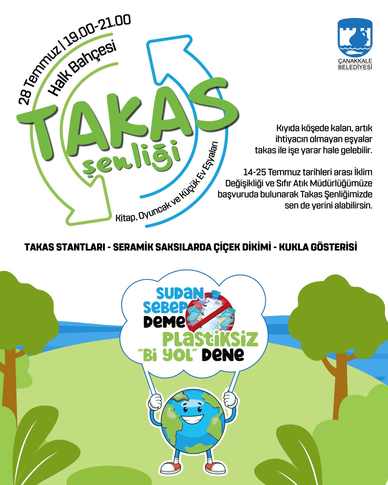 28 Temmuz 2025 Pazartesi günü 19.00-21.00 saatleri arasında Halk Bahçesinde düzenlenecek olan Takas Şenliği ile kitap, oyuncak, küçük ev eşyaları gibi ihtiyaç fazlası ürünlerin yeniden değerlendirilmesi amaçlanıyor. Takas stantlarının yanı sıra seramik saksılarda çiçek dikimi ve kukla gösterisi gibi etkinliklerin de yer alacağı Takas Şenliğine katılım için 14-25 Temmuz 2025 tarihleri arasında İklim Değişikliği ve Sıfır Atık Müdürlüğüne başvuruda bulunulabilir.