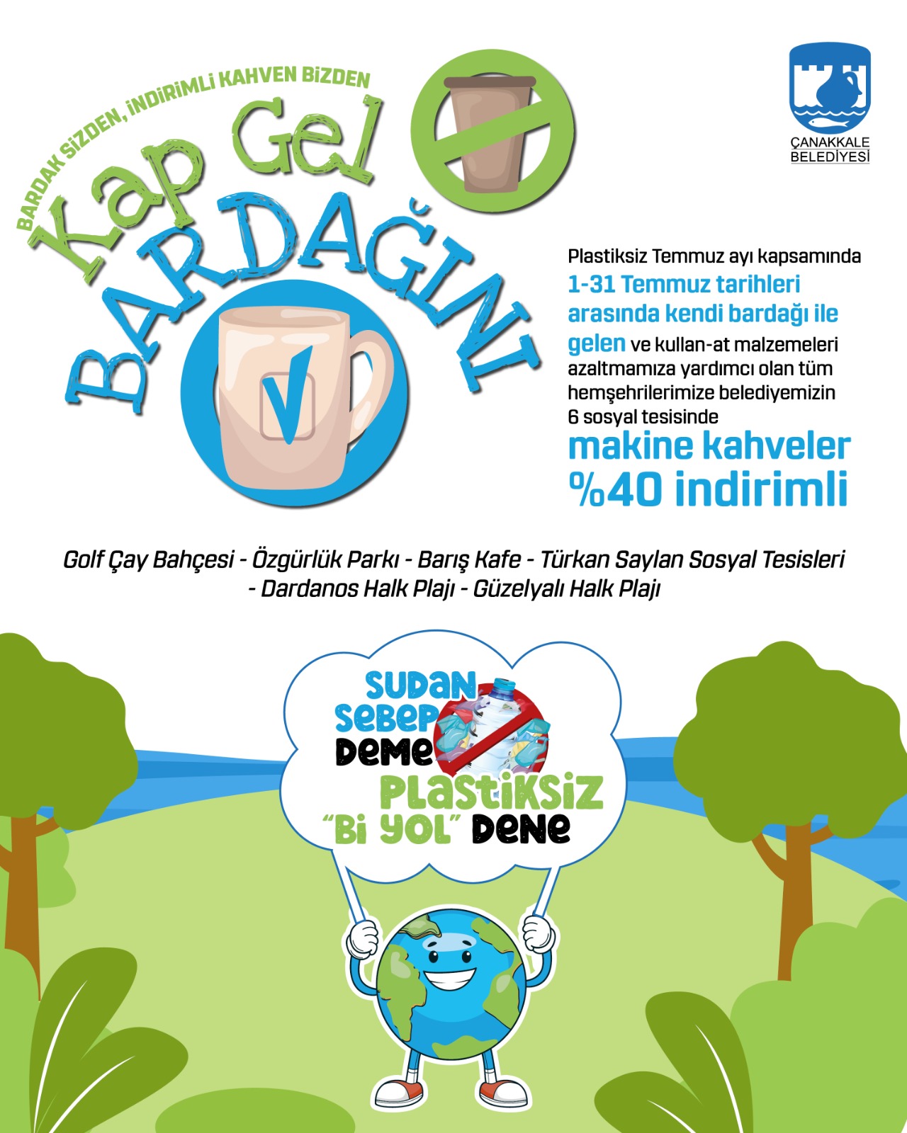 Plastiksiz Temmuz ayı kapsamında 1-31 tarihleri arasında kendi bardağı ile gelen ve kullan-at malzemeleri azaltmamıza yardımcı olan tüm hemşehrilerimize belediyemizin 6 sosyal tesisinde (Golf Çay Bahçesi, Özgürlük Parkı, Barış Kafe, Türkan Saylan Sosyal Tesisleri, Dardanos Halk Plajı ve Güzelyalı Halk Plajı) makine kahveler yüzde 40 indirimli olacak.