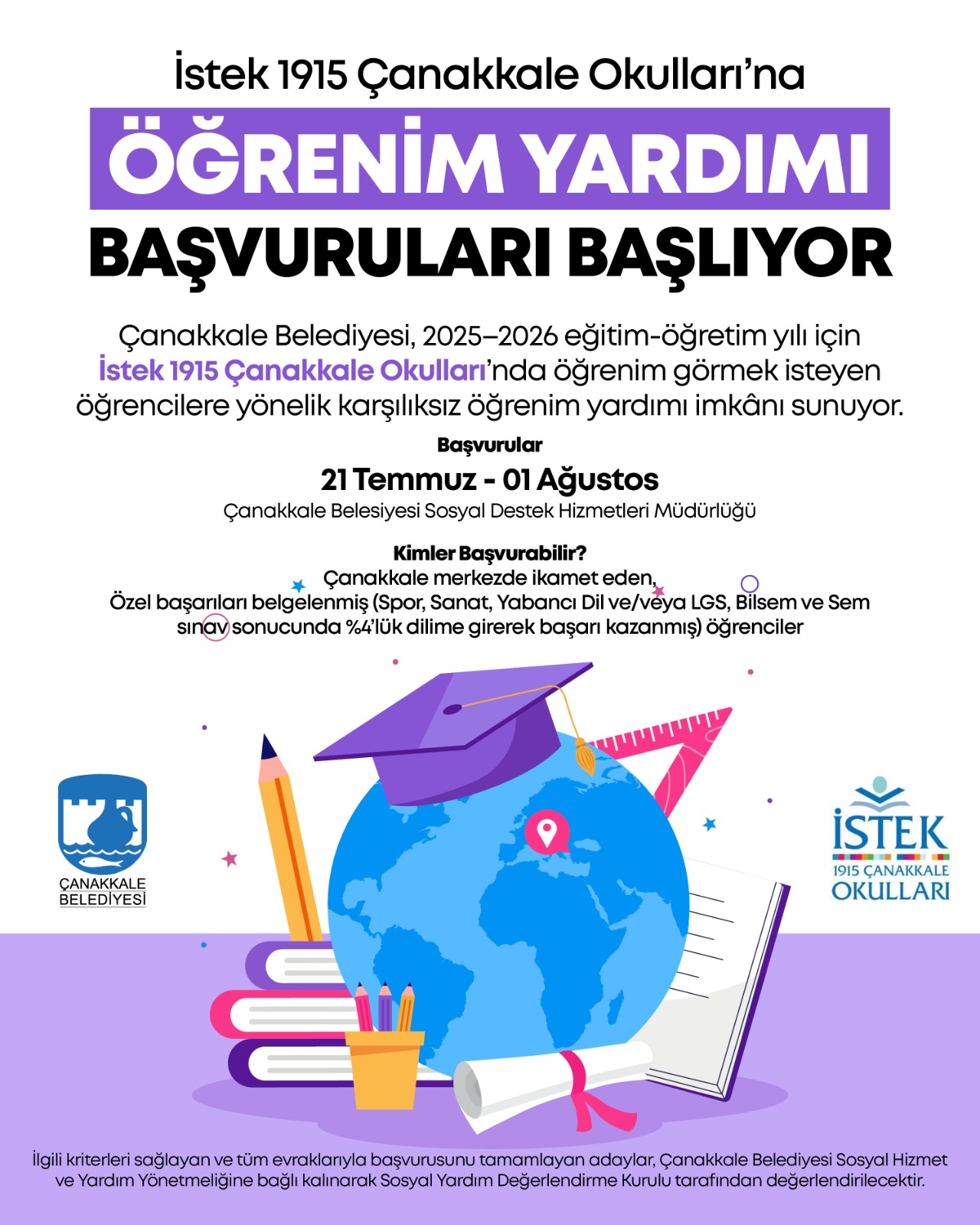 Çanakkale Belediyesi, eğitimde fırsat eşitliğini desteklemek amacıyla 2025–2026 eğitim-öğretim yılı için önemli bir sosyal destek programını daha hayata geçiriyor. Bu kapsamda, İstek 1915 Çanakkale Okulları’nda öğrenim görmek isteyen ve belirlenen şartları sağlayan öğrencilere karşılıksız öğrenim yardımı verilecektir.