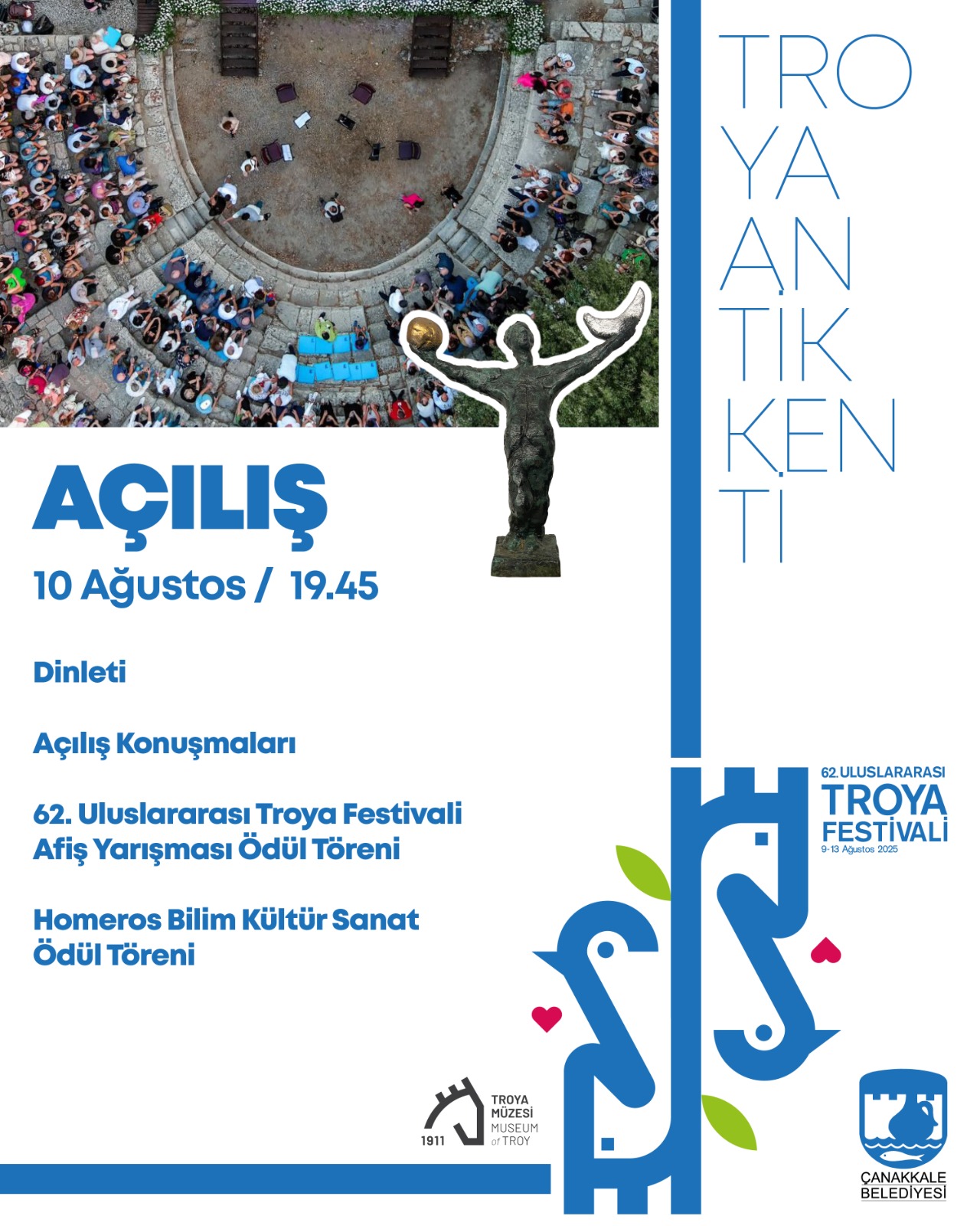 9-13 Ağustos 2025 tarihleri arasında 62. kez hemşehrilerimizle buluşacak olan Uluslararası Troya Festivali'nin resmi açılış programı,10 Ağustos 2025 Pazar günü gerçekleşecek.