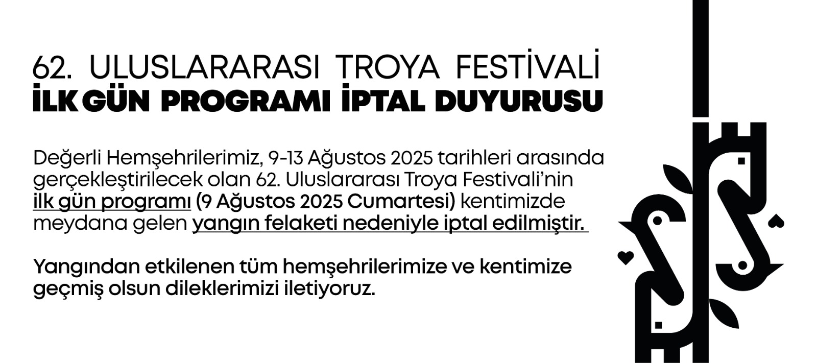 9-13 Ağustos 2025 tarihleri arasında gerçekleştirilecek olan 62. Uluslararası Troya Festivali’nin ilk gün programı (9 Ağustos 2025 Cumartesi) kentimizde meydana gelen yangın felaketi nedeniyle iptal edilmiştir.