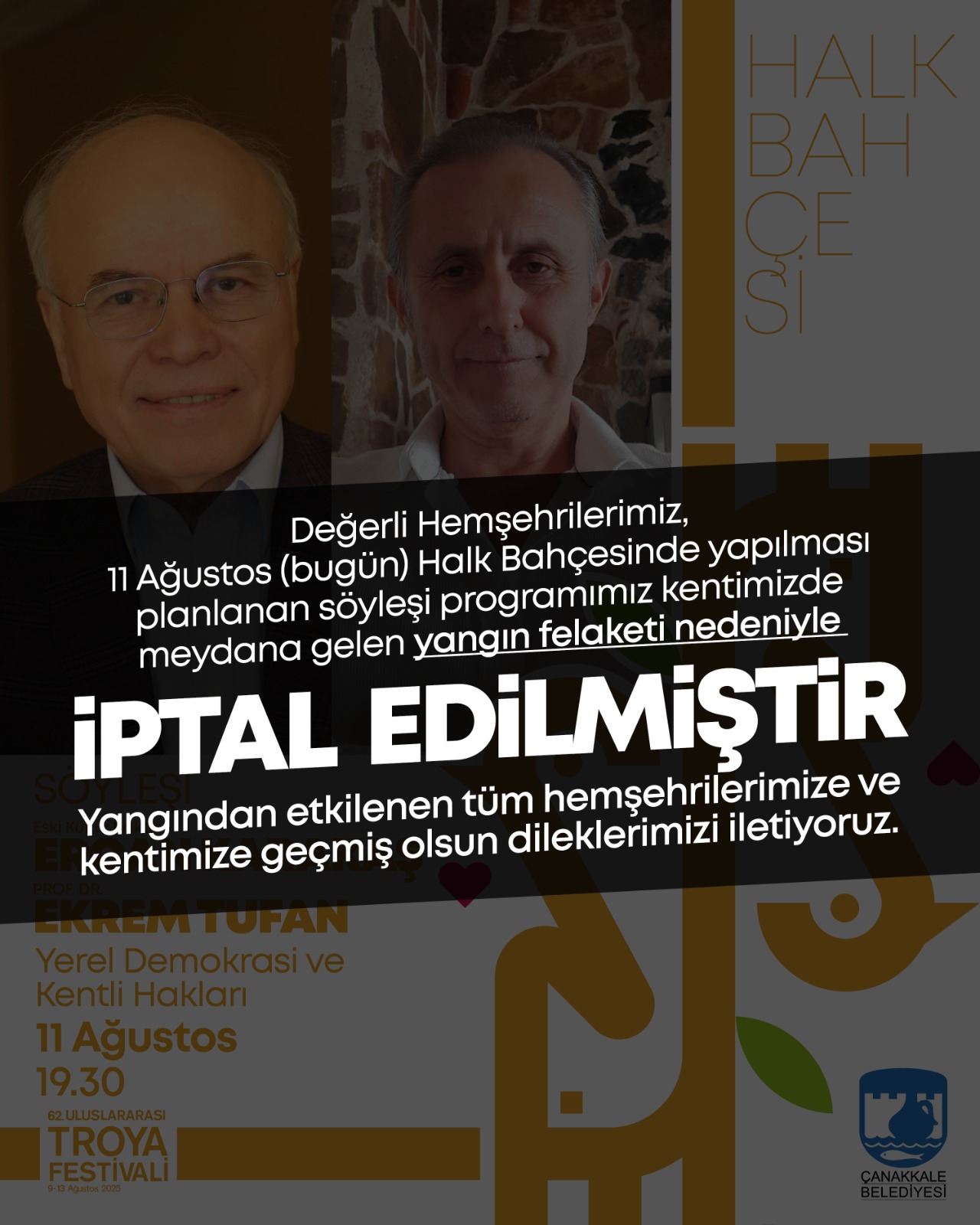 62. Uluslararası Troya Festivali kapsamında bugün (11 Ağustos 2025 Pazartesi) saat 19.30’da Halk Bahçesi’nde düzenlenecek olan söyleşi, kentimizde yaşanan yangın felaketi nedeniyle iptal edilmiştir.