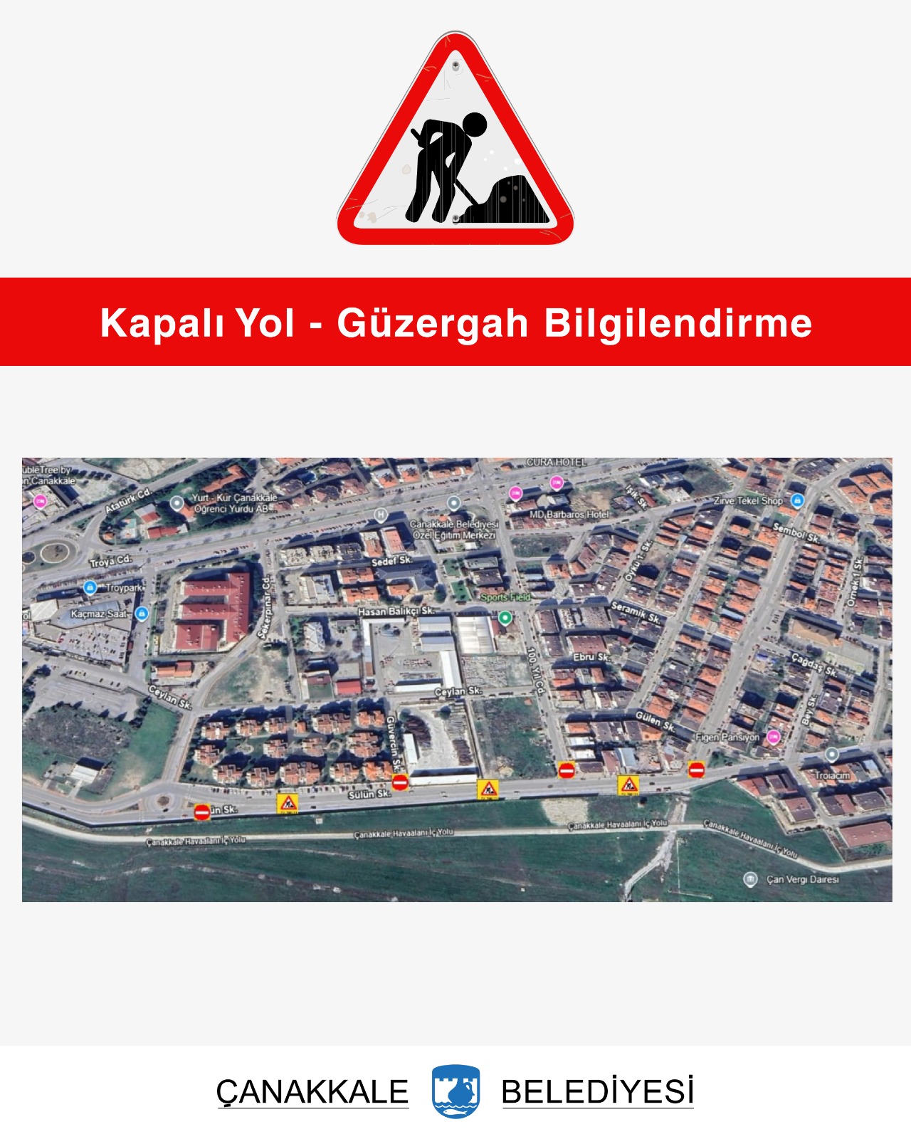 Fen İşleri Müdürlüğünce gerçekleştirilecek üstyapı çalışmaları kapsamında Barbaros Mahallesi Sülün Sokak ve ekli krokide belirtilen bağlantı yolları 25 Ağustos 2025 Pazartesi günü itibarıyla çalışmalar süresince yaya ve araç trafiğine kapalı olacaktır.