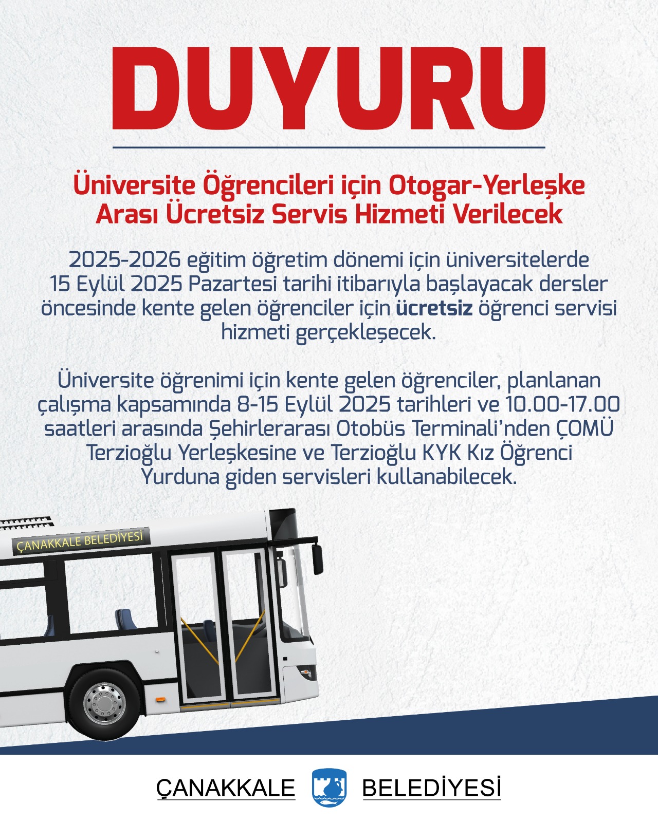 2025-2026 eğitim öğretim dönemi için üniversitelerde 15 Eylül 2025 Pazartesi tarihi itibarıyla başlayacak dersler öncesinde kente gelen öğrenciler için ücretsiz öğrenci servisi hizmeti gerçekleşecek.
