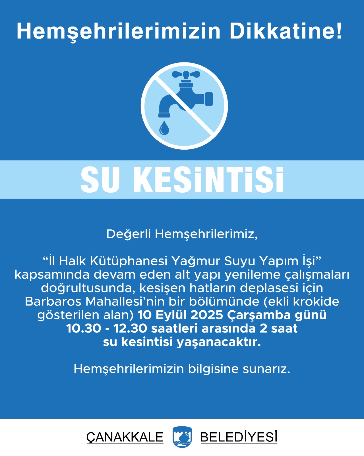 “İl Halk Kütüphanesi Yağmur Suyu Yapım İşi” kapsamında devam eden alt yapı yenileme çalışmaları doğrultusunda, kesişen hatların deplasesi için Barbaros Mahallesi’nin bir bölümünde (ekli krokide gösterilen alan) 10 Eylül 2025 Çarşamba günü 10.30 - 12.30 saatleri arasında