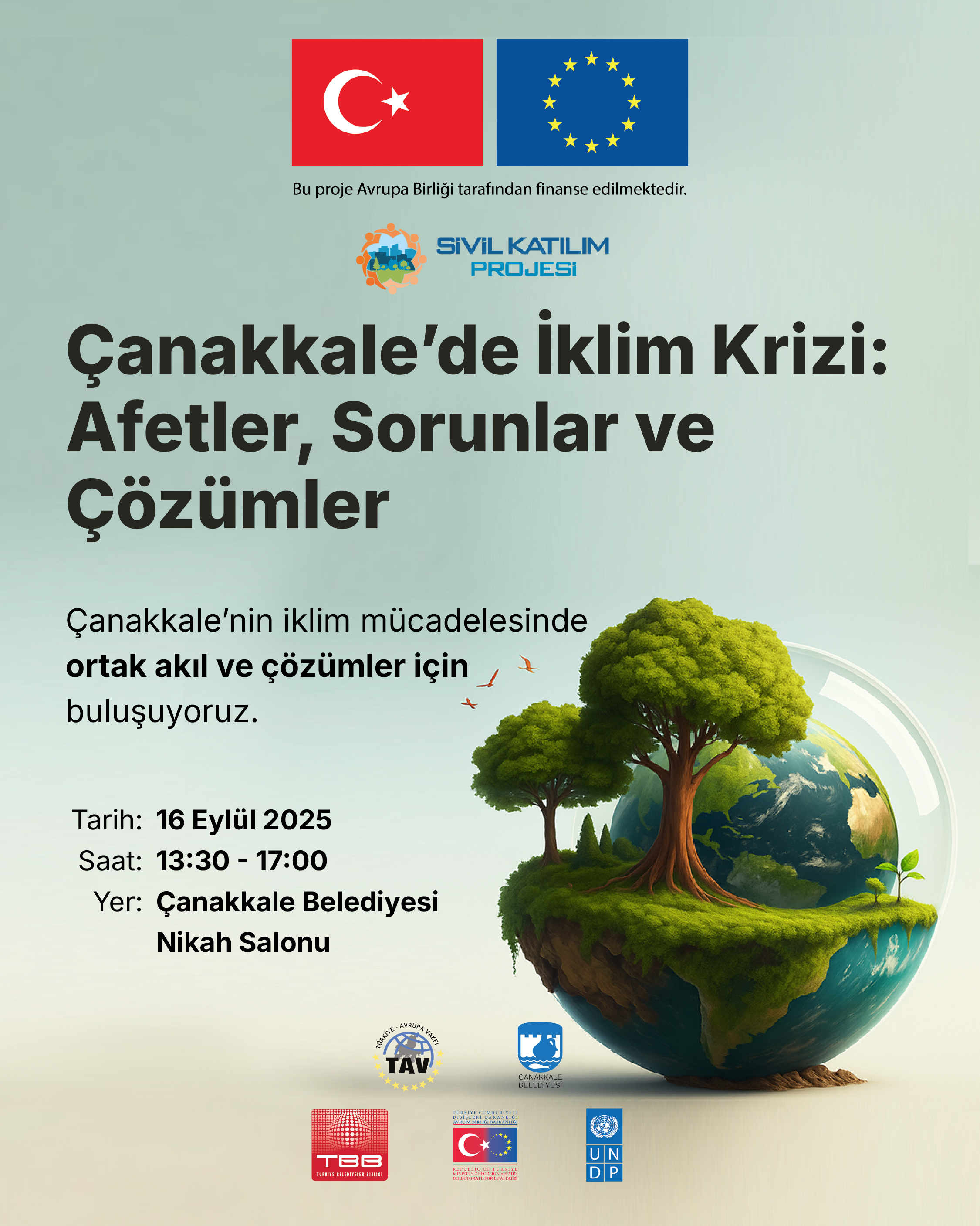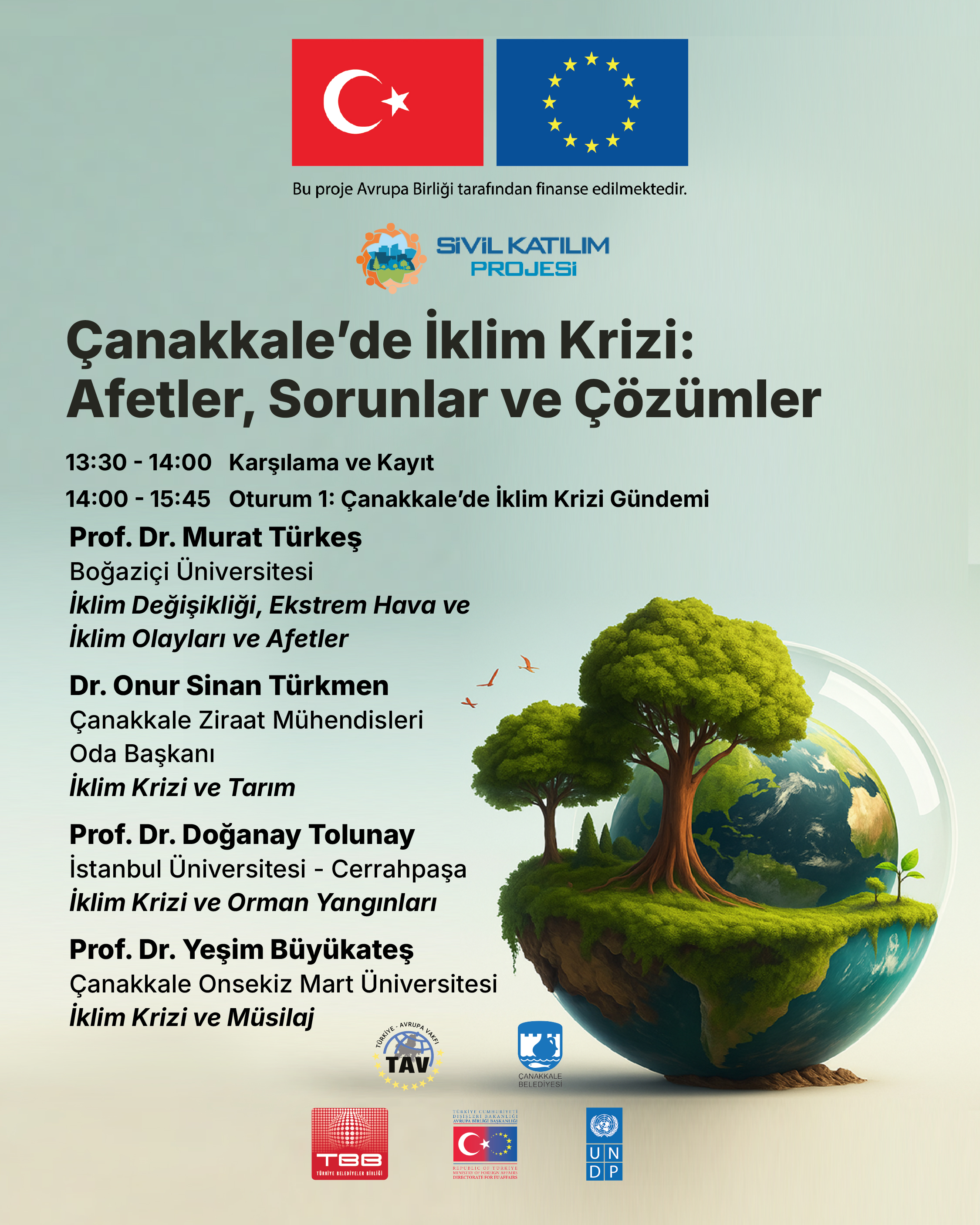 Çanakkale'de, iklim değişikliği ile ilgili politikaların (İklim Eylem Planı) uygulanması ve izlenmesinde sivil toplumun ve hemşehrilerin katılımını sağlamak, güçlendirmek ve sürdürülebilir kılmak amacıyla, Birleşmiş Milletler Kalkınma Programı (UNDP) tarafından desteklenen, Türkiye Avrupa Vakfı ve Belediyemiz ortaklığında yürütülen “Bir Katılımcı ve Kapsayıcı İklim Eylem Modeli: Çanakkale İklim Eylem Grubu ve İklim Elçileri” projesi kapsamında "Çanakkale'de İklim Krizi: Afetler, Sorunlar ve Çözümler" başlıklı panel gerçekleşecek.