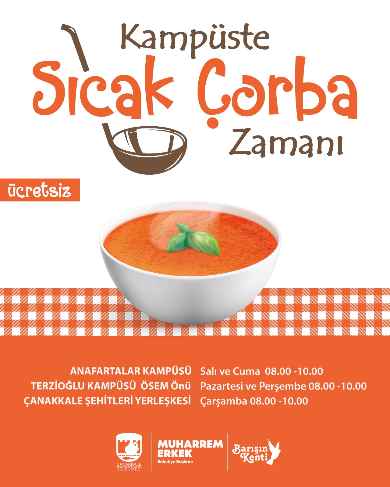 Öğrencilerden yoğun ilgi gören sıcak çorba ikramları, Terzioğlu Yerleşkesi ÖSEM önünde pazartesi ve perşembe günleri, Anafartalar Kampüsünde salı ve cuma günleri, Çanakkale Şehitleri Yerleşkesinde ise çarşamba günleri olmak üzere, 08.00-10.00 saatleri arasında gerçekleşecek.