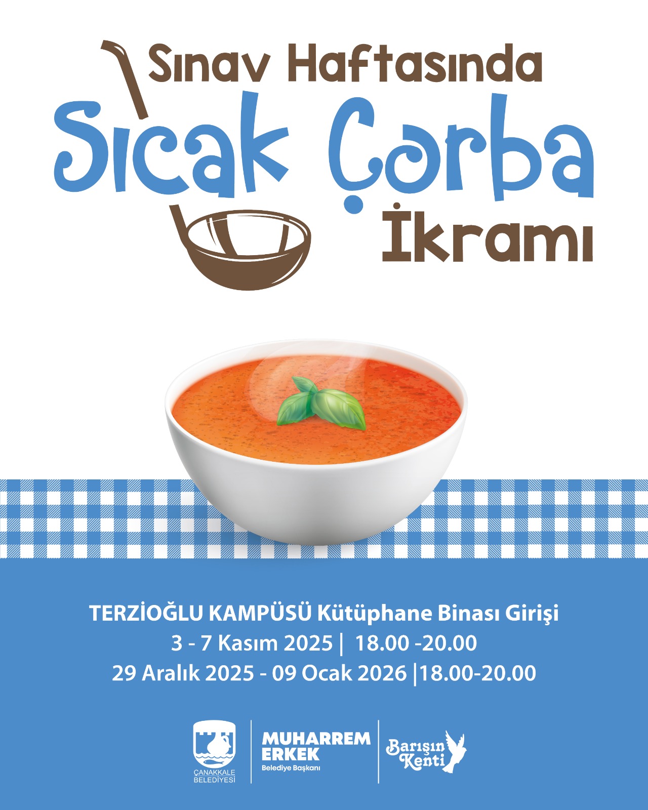 Ayrıca, 3-7 Kasım 2025 tarihleri arasındaki sınav haftası ile 29 Aralık 2025 – 9 Ocak 2026 tarihleri arasındaki sınav haftasında, 18.00-20.00 saatleri arasında, Terzioğlu Yerleşkesi kütüphane önünde de sıcak çorba ikramı yapılacak.
