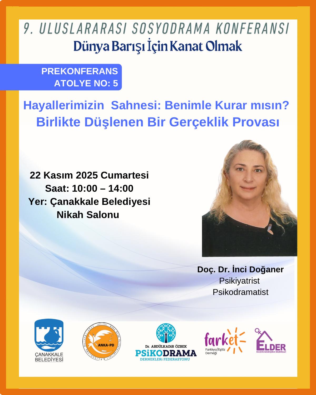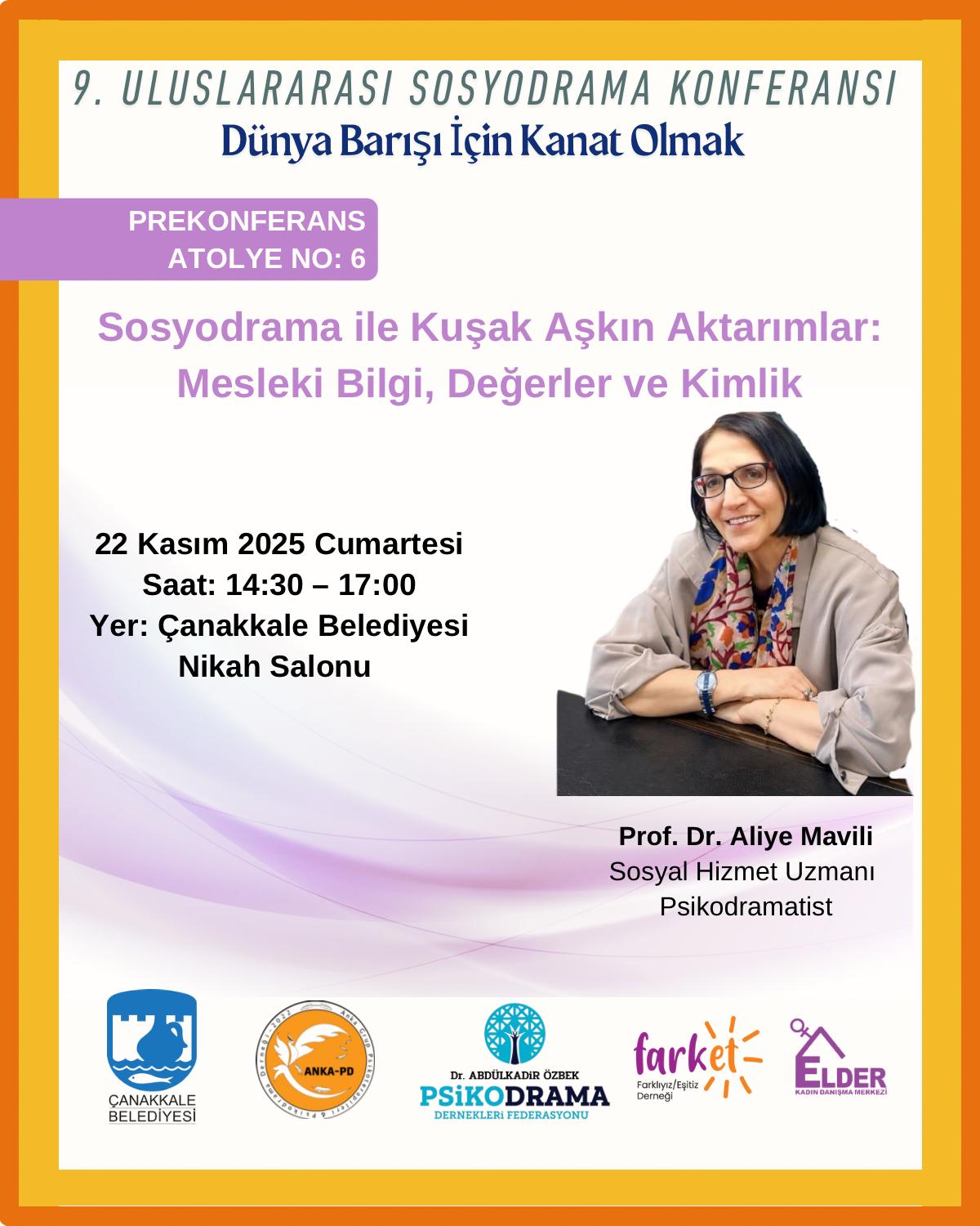 1-5 Temmuz 2026 tarihleri arasında düzenlenmesi planlanan 9. Uluslararası Sosyodrama Konferansına hazırlık kapsamında, 22 Kasım 2025 Cumartesi günü Çanakkale Belediyesi Nikah Salonu'nda iki farklı atölye çalışması gerçekleşecek.