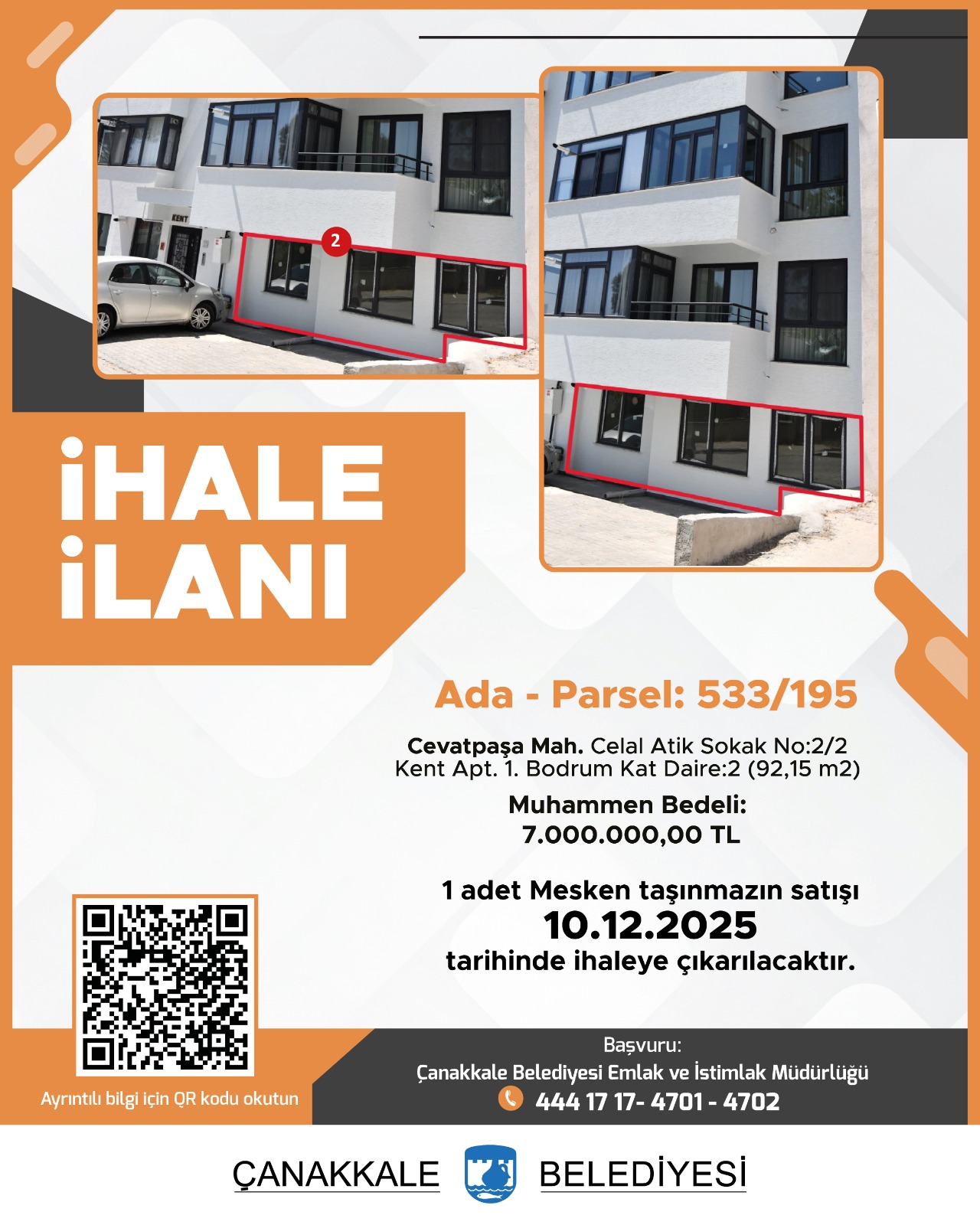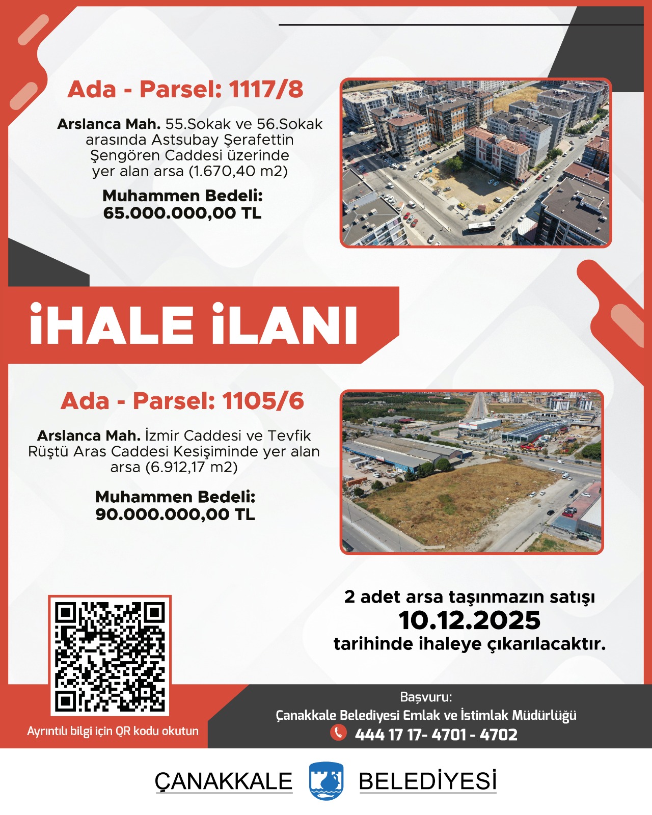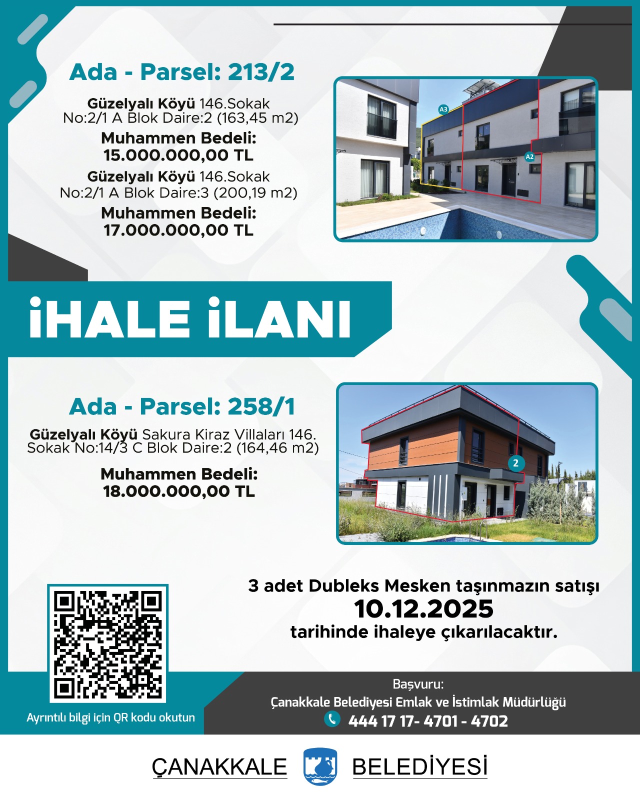 Mülkiyetleri Belediyemize ait olan, aşağıda adresi, ada ve parseli, yüzölçümü, cinsi, muhammen bedeli, geçici teminatı, imar durumu, ihale tarihi ve saati belirtilen 6 (altı) adet taşınmaz, Çanakkale Belediyesi meclis salonunda 2886 sayılı Devlet İhale Kanunu'nun 35.maddesinin (a) bendine göre Kapalı Teklif Usulü ile satılacaktır.