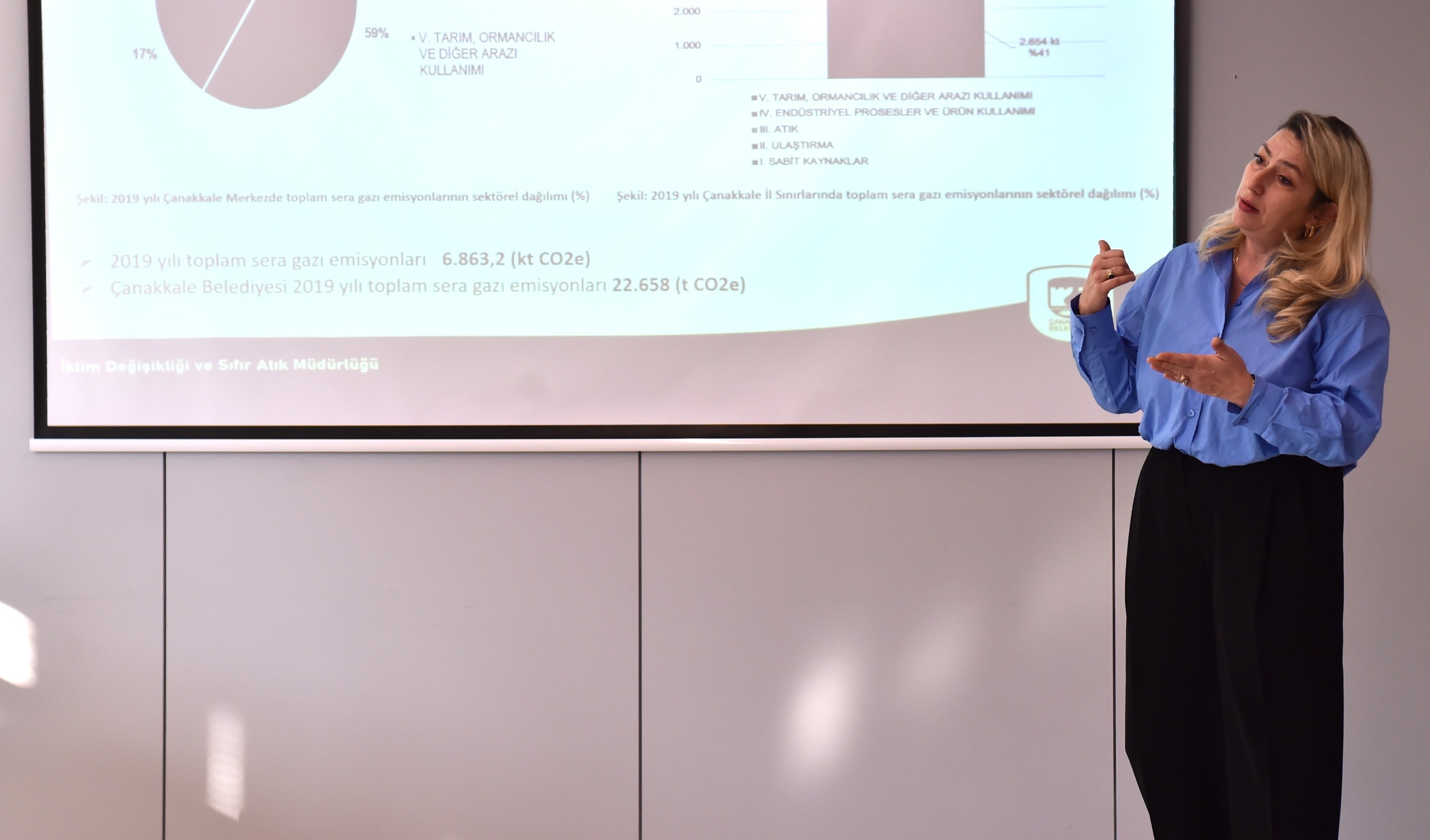 İklim Değişikliği ve Sıfır Atık Müdürü Aysun Kavcar tarafından verilen eğitimde, Çanakkale Bölgesel Katı Atık Yönetim Projesi başta olmak üzere, kent merkezi ve havza genelinde uygulanan atık yönetimi çalışmaları hakkında kapsamlı bilgiler paylaşıldı.
