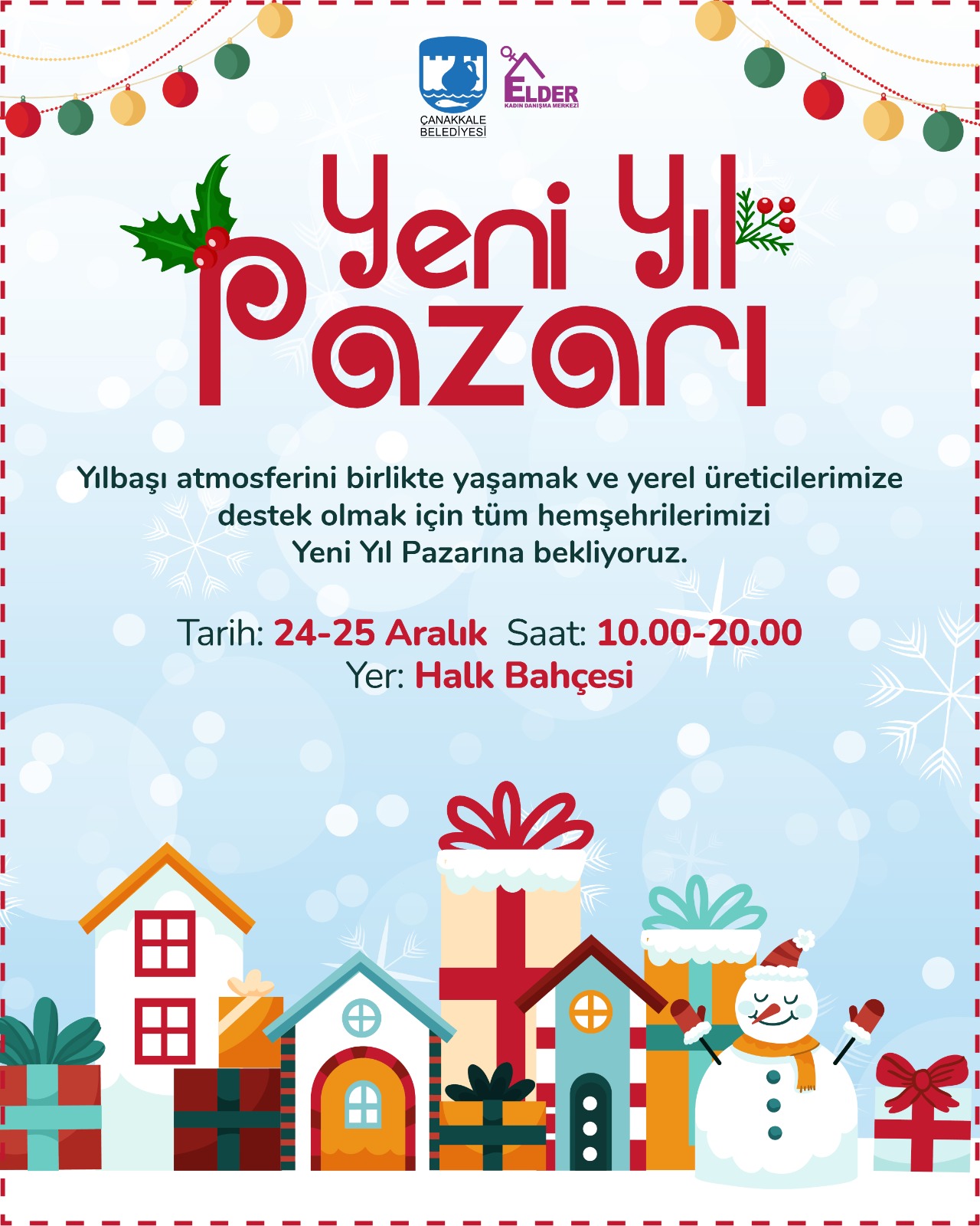 Çanakkale Kültür ve Sanat Derneği ile ELDER Kadın Danışma Merkezi tarafından hazırlanan Yeni Yıl Pazarı, 24-25 Aralık ile 27-31 Aralık 2025 tarihlerinde 10.00-20.00 saatleri arasında ziyarete açık olacak.