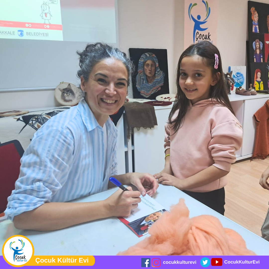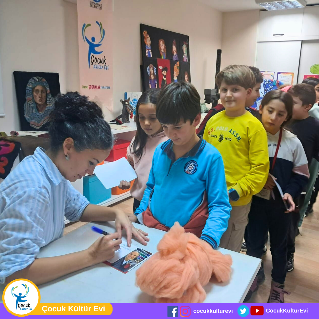 Söyleşinin ardından çocuklar için hazırlanan anı kartlarını imzalayan konuk sanatçıya, Çanakkale Belediyesi adına Çanakkale Seramiği takdim edildi. Çocukların yoğun ilgi gösterdiği buluşma toplu fotoğraf çekimi ile sona erdi.