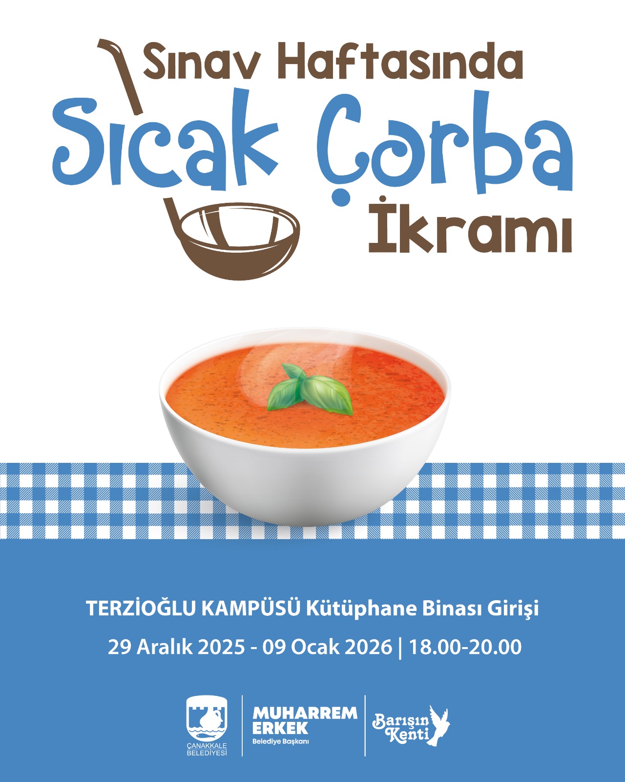 Üniversite öğrencilerimizin sınav haftalarında keyifli bir mola vermeleri için düzenlenen sıcak çorba ikramları; 29 Aralık 2025-9 Ocak 2026 tarihlerinde, 18.00 – 20.00 saatleri arasında ÇOMÜ Terzioğlu Kampüsü Kütüphane Binası girişinde gerçekleşecek.