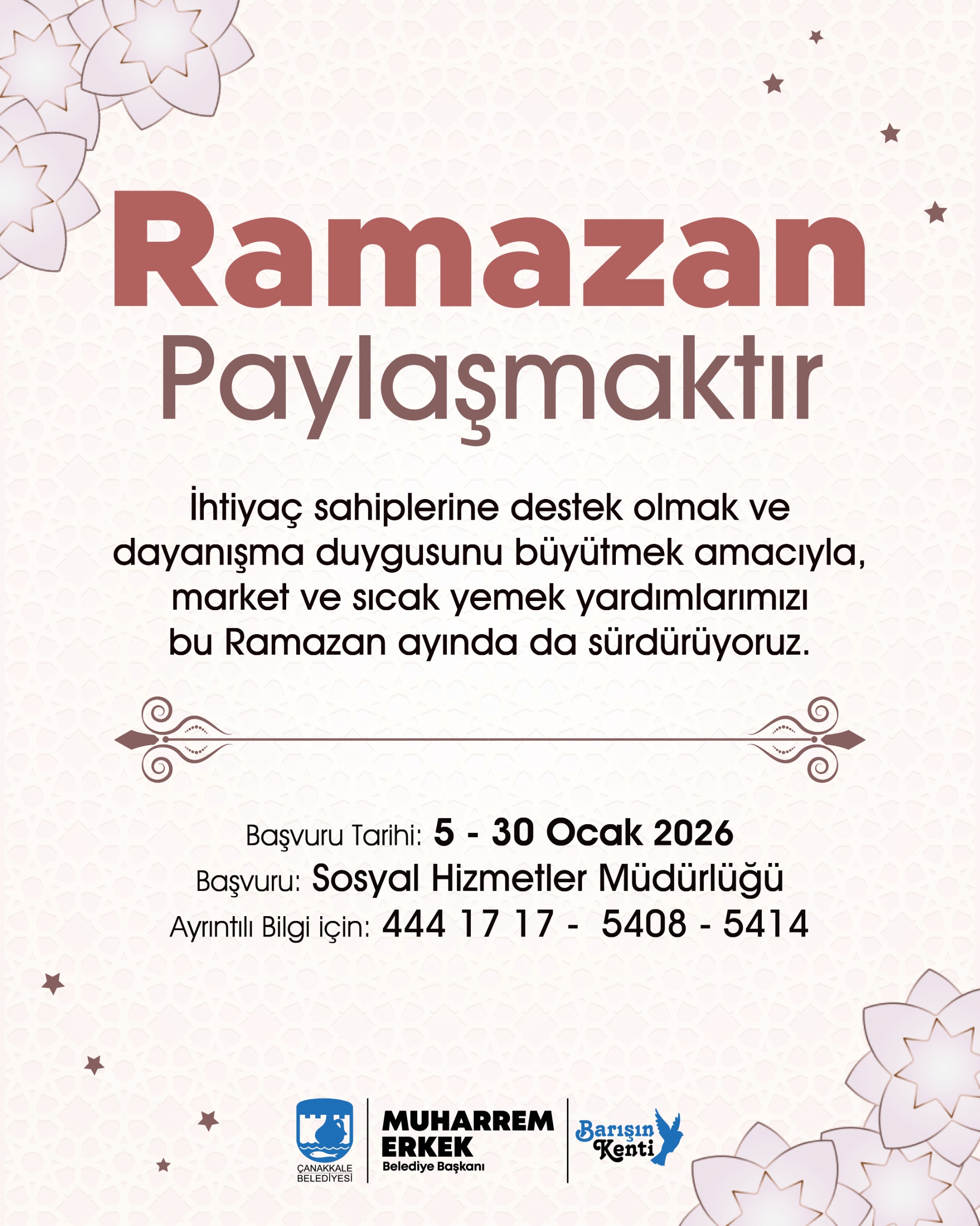 Market ve sıcak yemek desteği almak isteyen ihtiyaç sahibi hemşehrilerimiz, 5-30 Ocak 2026 tarihleri arasında Sosyal Hizmetler Müdürlüğüne başvuruda bulunabilir, 444 17 17 numaralı Çağrı Merkezi’mizin 5408 ve 5414 dahili hattından detaylı bilgi alabilirler.