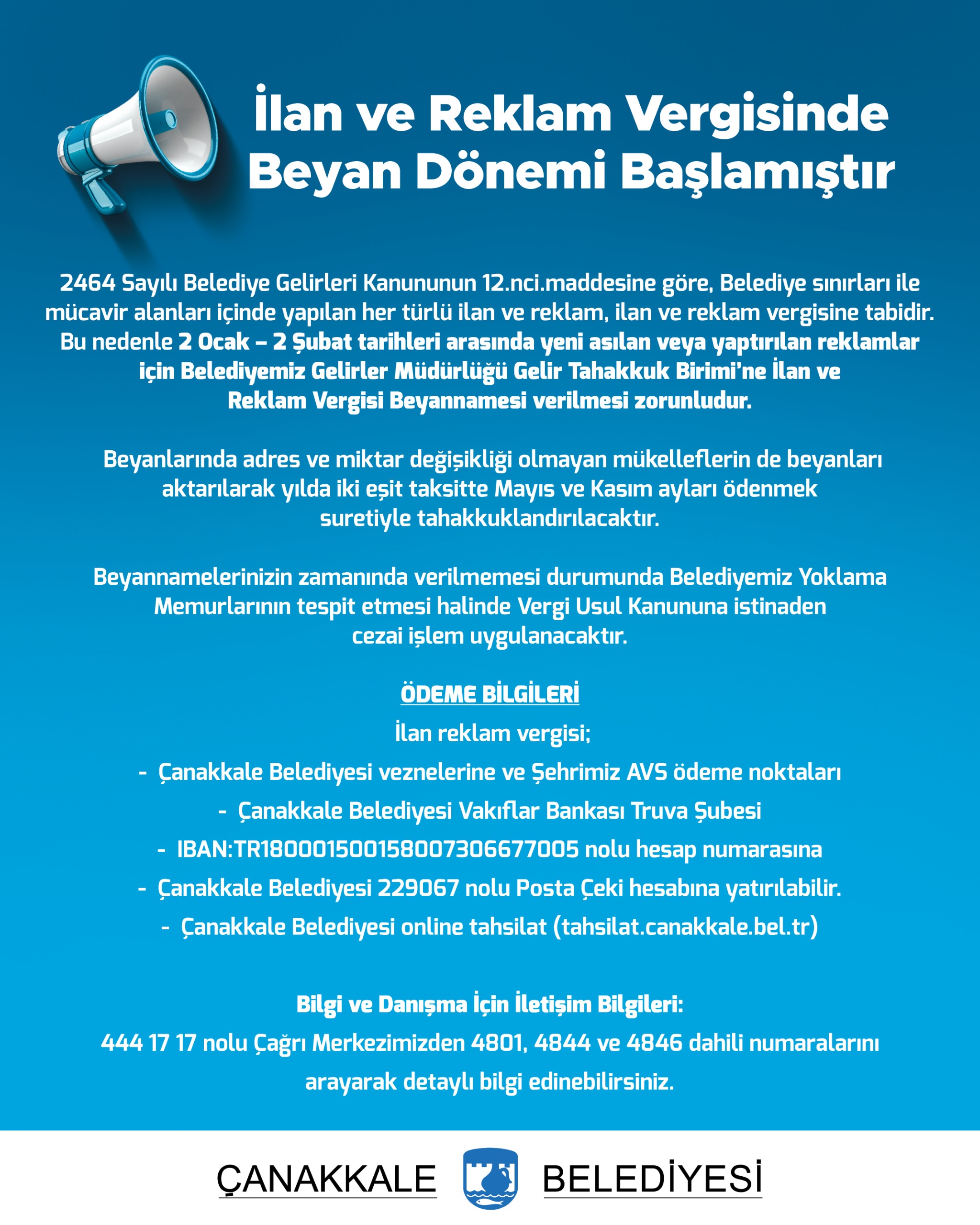 2464 Sayılı Belediye Gelirleri Kanununun 12.nci.maddesine göre, Belediye sınırları ile mücavir alanları içinde yapılan her türlü ilan ve reklam, ilan ve reklam vergisine tabidir. Bu nedenle 2 Ocak – 2 Şubat tarihleri arasında yeni asılan veya yaptırılan reklamlar için Belediyemiz Gelirler Müdürlüğü Gelir Tahakkuk Birimi'ne İlan ve Reklam Vergisi Beyannamesi verilmesi zorunludur. Beyanlarında adres ve miktar değişikliği olmayan mükelleflerin de beyanları aktarılarak yılda iki eşit taksitte (Mayıs ve Kasım ayları) ödenmek suretiyle tahakkuklandırılacaktır. Beyannamelerinizin zamanında verilmemesi durumunda Belediyemiz Yoklama Memurlarının tespit etmesi halinde Vergi Usul Kanununa istinaden cezai işlem uygulanacaktır.