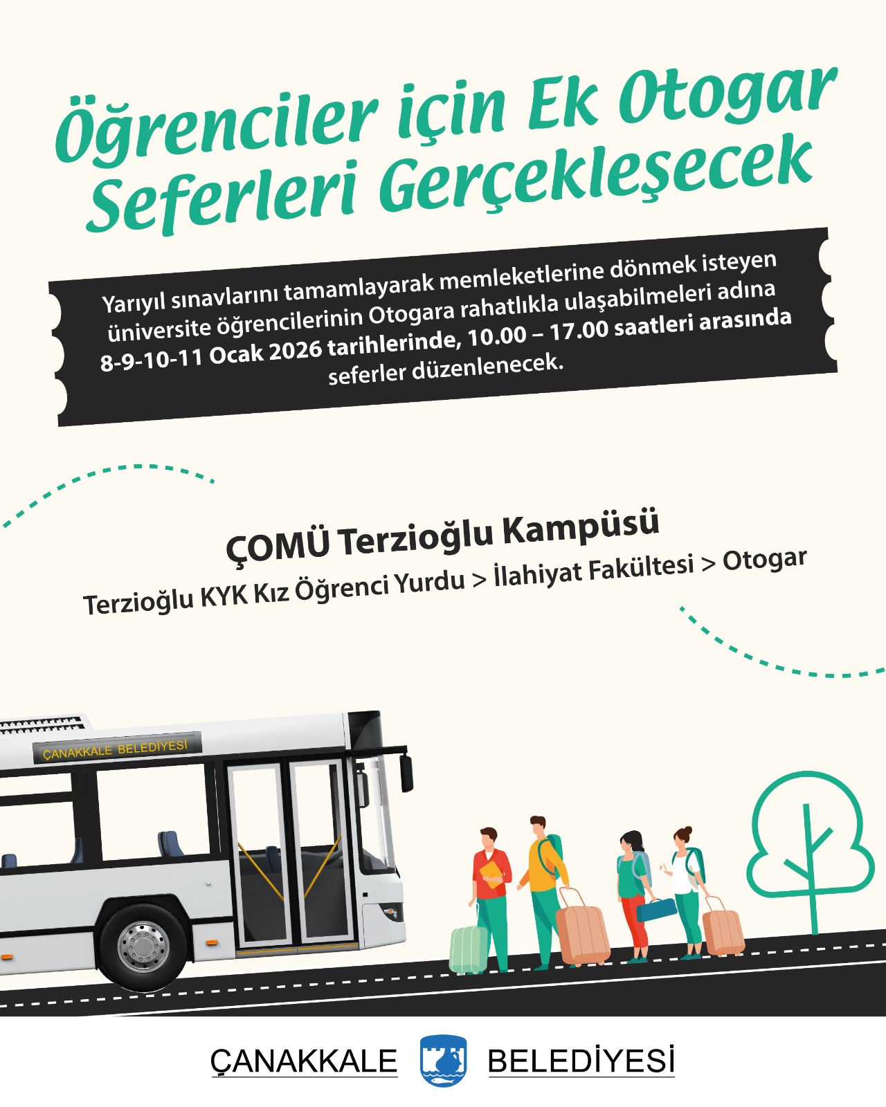 9 Ocak 2026 tarihinde 2025-2026 eğitim öğretim yılının güz döneminin sona ermesi ile birlikte memleketlerine dönüş yapacak üniversite öğrencilerinin ulaşımdan rahatlıkla yararlanabilmeleri adına 8-9-10-11 Ocak 2026 tarihlerinde, 10.00 – 17.00 saatleri arasında seferler düzenlenecek. Çanakkale Onsekiz Mart Üniversitesi Terzioğlu Kampüsü’nden hareket edecek olan otobüsler, Üstün Korugan Caddesi ile Lozan Caddesi kesişimindeki Terzioğlu KYK Kız Öğrenci Yurdu, İlahiyat Fakültesi ve çevre yolu güzergahından Çanakkale Otogarına gidecek.