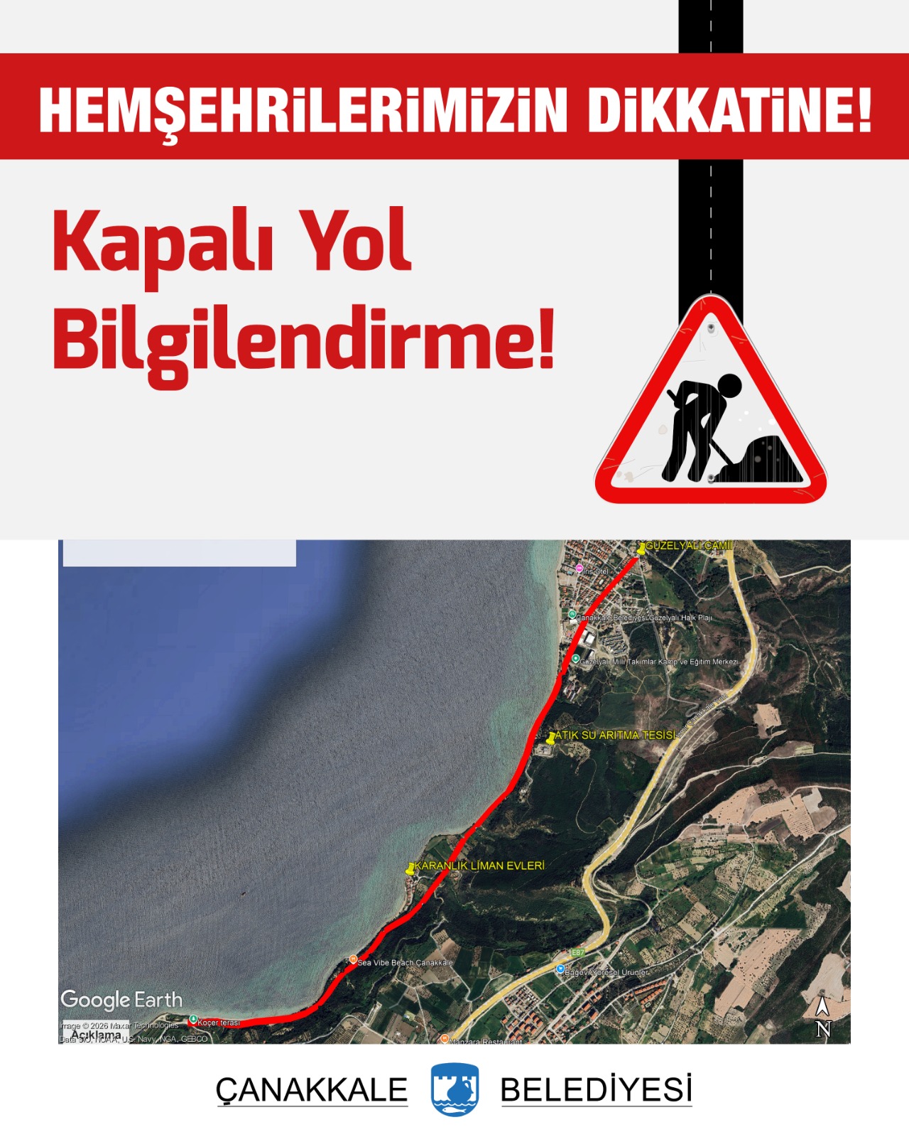 Çanakkale Belediyesi Su ve Kanalizasyon Müdürlüğünce, arıtılmış atık suyun yeşil alan sulamasında kullanılması amacıyla hazırlanan Mor Şebeke Projesi’nin çalışmaları kapsamında ekli krokide belirtilen alanda yapılacak kazı çalışmaları sebebiyle, 19-23 Ocak 2026 tarihleri arasında Güzelyalı- Kumkale Yolu (Karanlık Liman Mevkii) çift yönlü olarak araç ve yaya trafiğine kapalı olacaktır.