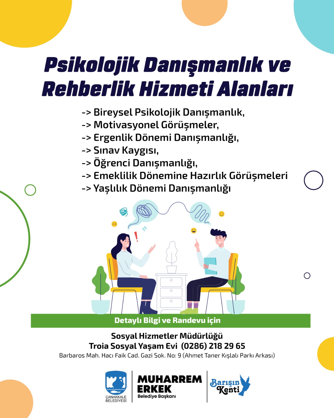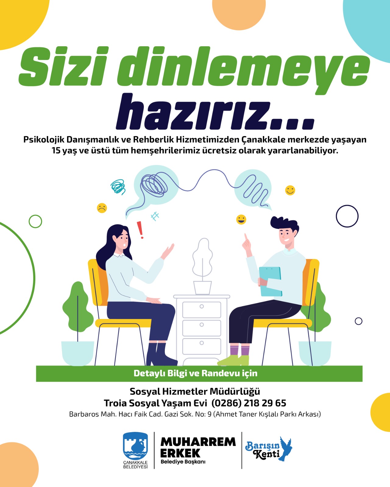 Çanakkale merkezde yaşayan 15 yaş ve üzeri tüm hemşehrilerimiz, belediyemizin Psikolojik Danışmanlık ve Rehberlik Hizmetlerinden ücretsiz olarak yararlanabiliyor.