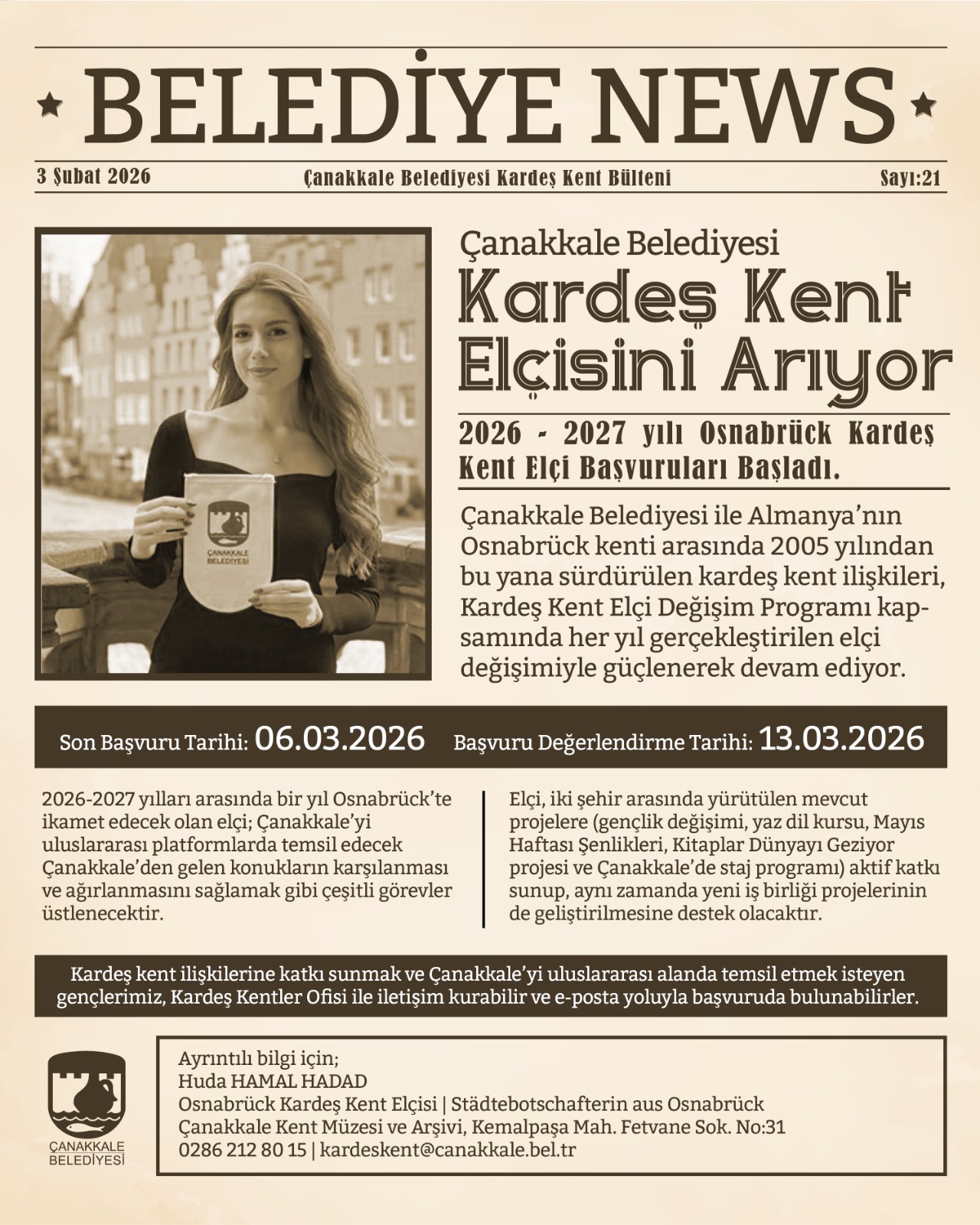 Bu kapsamda, 1 Ekim 2026 – 30 Eylül 2027 tarihleri arasında Çanakkale’yi Osnabrück’te temsil edecek Çanakkale Kardeş Kent Elçisi için başvurular başladı.