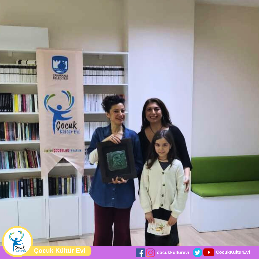 Çocukların yoğun ilgi gösterdiği buluşma, konuk yazara Çanakkale Belediyesi adına Çocuk Kültür Evi Koordinatörü Evren Aldoğan tarafından Çanakkale Seramiği takdimi ve toplu fotoğraf çekiminin ardından sona erdi.