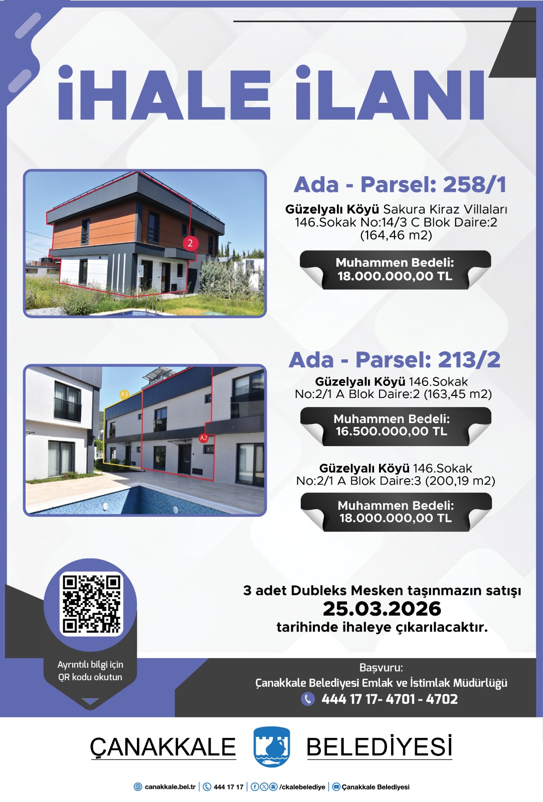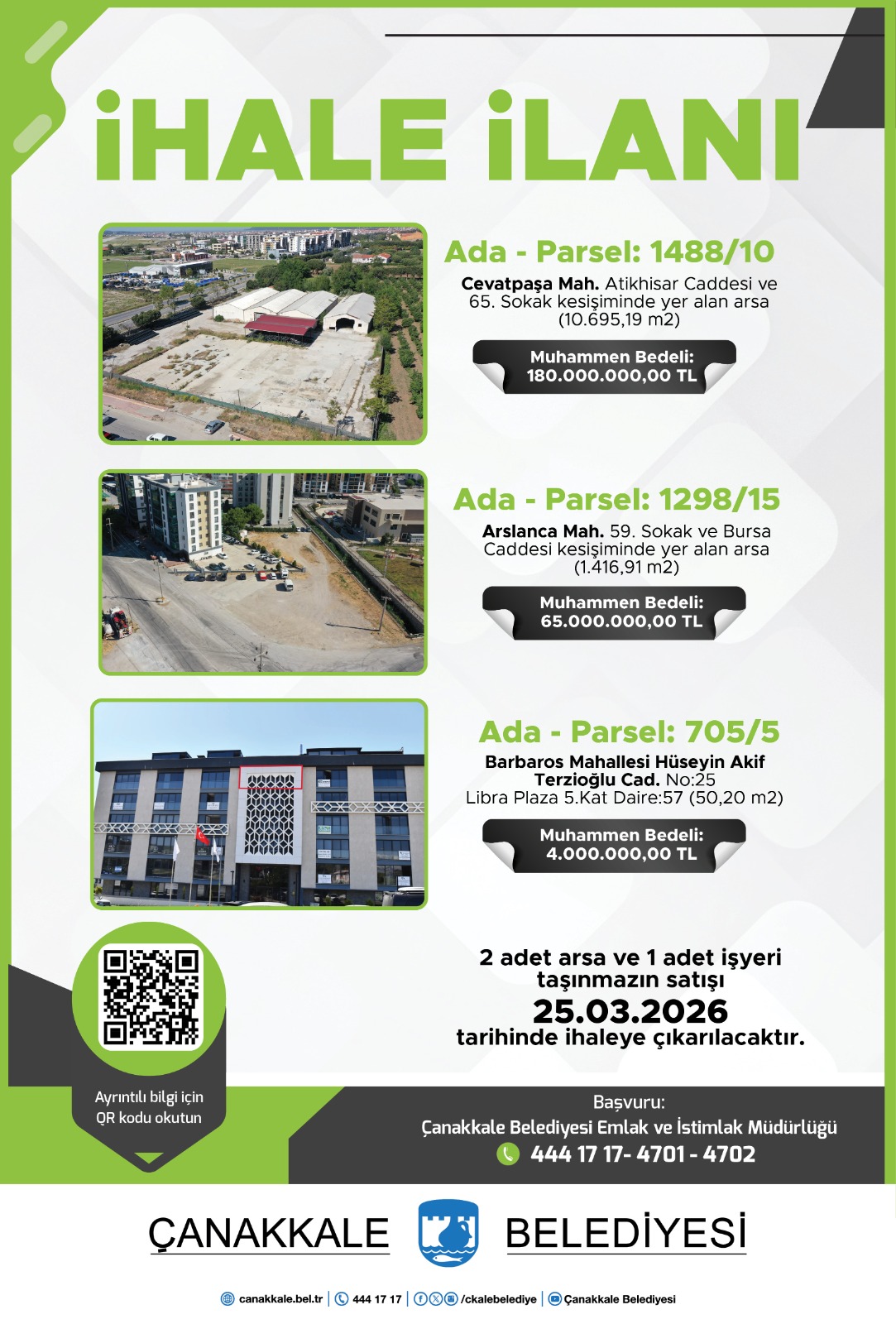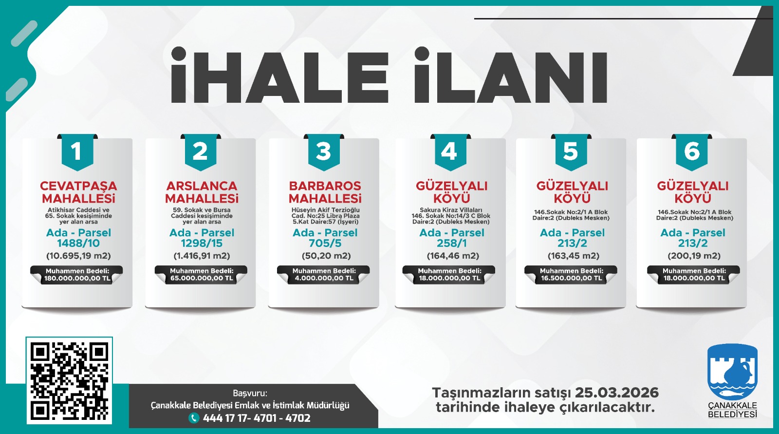 Mülkiyetleri Belediyemize ait olan, aşağıda adresi, ada ve parseli, yüzölçümü, cinsi, muhammen bedeli, geçici teminatı, imar durumu, ihale tarihi ve saati, ihale dosya bedeli belirtilen 6 (altı) adet taşınmaz, Çanakkale Belediyesi meclis salonunda 2886 sayılı Devlet İhale Kanunu'nun 35.maddesinin (a) bendine göre Kapalı Teklif Usulü ile satılacaktır.
