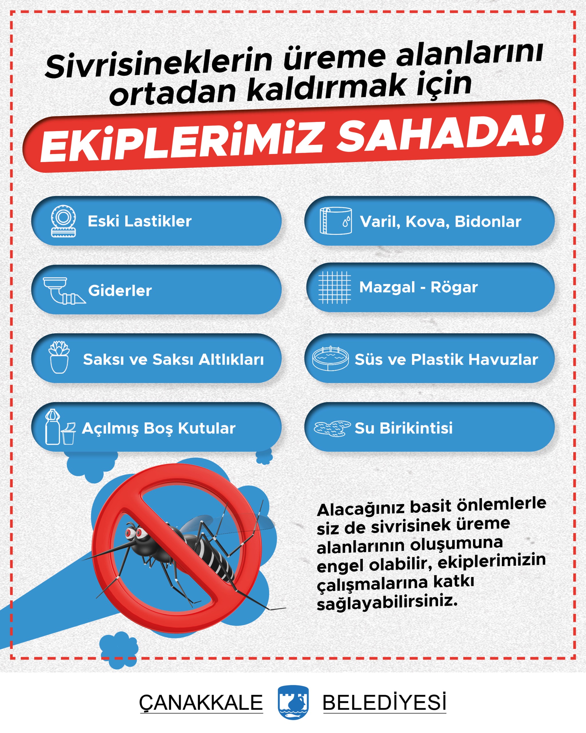 Çanakkale Belediyesi Temizlik İşleri Müdürlüğü tarafından sivrisinek ve karasineklerle mücadele çalışmaları yıl boyunca planlı şekilde sürdürülüyor. Biyosidal ürün uygulayıcı personellerin her yıl şubat ayında gerçekleştirdiği kışlak mücadelesi ile başlayan çalışmalar, larva mücadelesi ile sezon boyunca devam ediyor. Mayıs ayı sonu itibarıyla ise uçkun mücadelesi kapsamında ULV soğuk sisleme çalışmaları gerçekleştiriliyor.