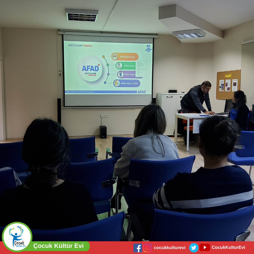 Çanakkale Belediyesi Afet İşleri Müdürlüğü ile Çanakkale İl Afet ve Acil Durum Müdürlüğü (AFAD) iş birliğinde gerçekleştirilen “Afet Farkındalığı Eğitimi” kapsamında ise AFAD Eğitim Uzmanı Muhammed Hasdemir ve Peknur Ballı’nın gerçekleştirdiği eğitime katılan Çocuk Kültür Evi eğitmenleri ve personelleri, olası bir afet öncesi, sırası ve sonrasında yapılacaklar hakkında detaylı bilgi edindiler.