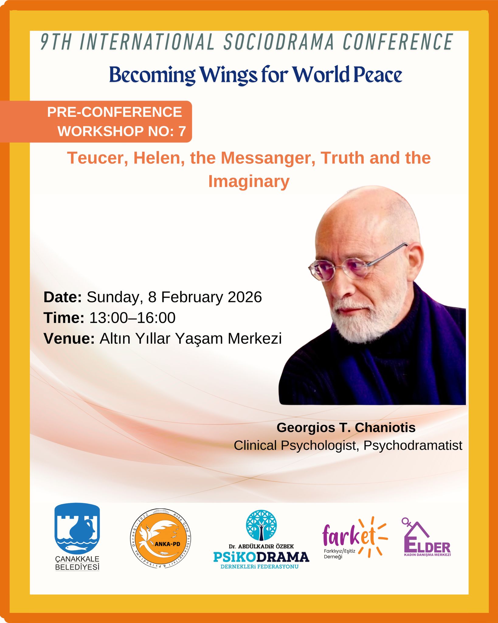 “Dünya Barışı İçin Kanat Olmak” sloganıyla çalışmaları yürütülen 9. Uluslararası Sosyodrama Konferansı öncesinde düzenlenen ön konferans atölyeleri kapsamında, klinik psikolog ve psikodramatist Georgios T. Chaniotis ile yürütülecek “Teucer, Helen, the Messenger, Truth and the Imaginary” başlıklı çalışma, 8 Şubat 2026 Pazar günü 13.00-16.00 saatleri arasında Altın Yıllar Yaşam Merkezi'nde gerçekleşecek.