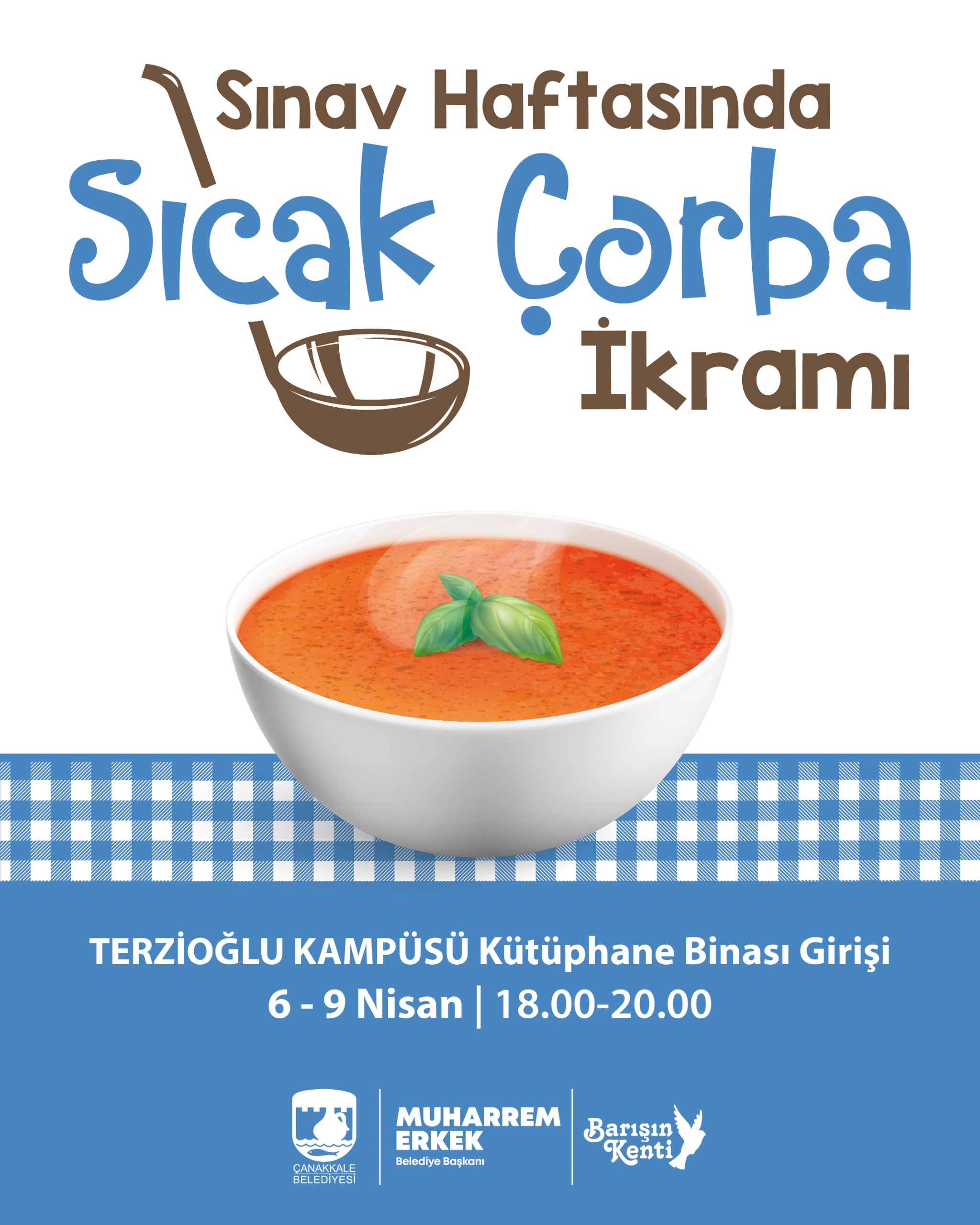 Üniversite öğrencilerimizin sınav haftalarında keyifli bir mola vermeleri için düzenlenen sıcak çorba ikramları; 6-9 Nisan 2026 tarihlerinde, 18.00 – 20.00 saatleri arasında ÇOMÜ Terzioğlu Kampüsü Kütüphane Binası girişinde gerçekleşecek.