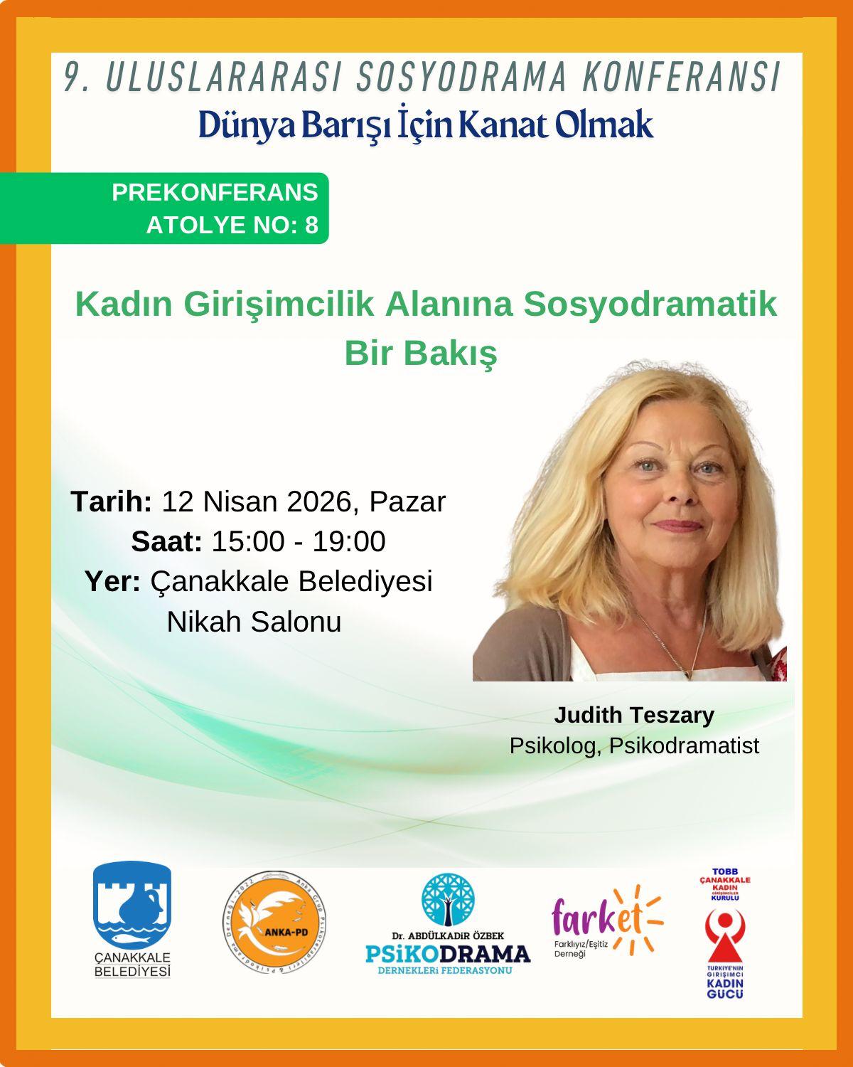 “Dünya Barışı İçin Kanat Olmak” sloganıyla çalışmaları yürütülen 9. Uluslararası Sosyodrama Konferansı öncesinde düzenlenen ön konferans atölyeleri kapsamında, psikolog ve psikodramatist Judith Teszary ile yürütülecek “Kadın Girişimcilik Alanına Sosyodramatik Bir Bakış” başlıklı çalışma, 12 Nisan 2026 Pazar günü 15.00 – 19.00 saatleri arasında Çanakkale Belediyesi Nikah Salonunda gerçekleşecek.