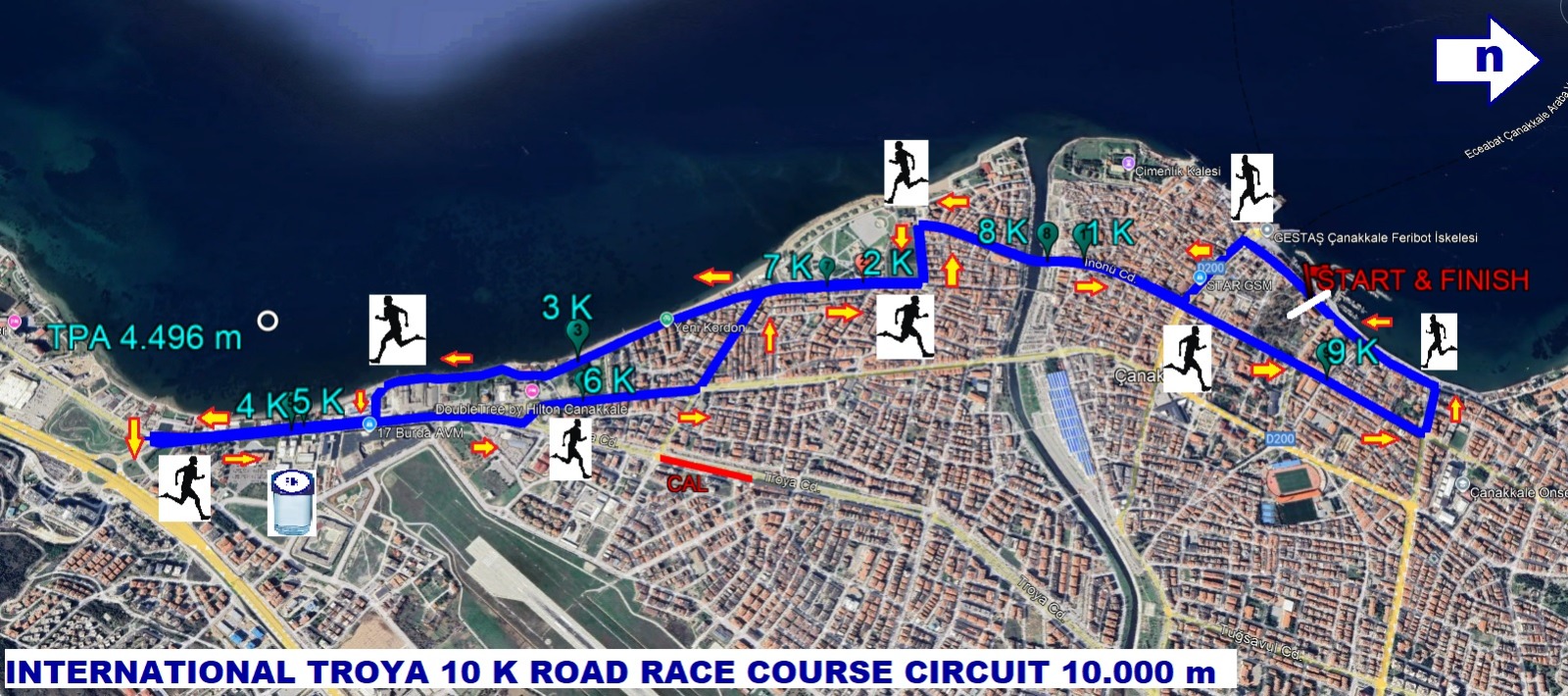 42K, 21K, 10K, 6K parkurları ve Çocuk Koşusu kategorilerinde düzenlenecek maraton; Tevfikiye Köyü Troya Ören Yeri otoparkı başlangıç noktası olmak üzere sırasıyla Tevfikiye Köy Yolu, Çıplak Köy Yolu, Çıplak Köy İçi Yolu, Tevfikiye Köy İçi Yolu, Tevfikiye–Kumkale yolu (stabilize toprak yol), Kumkale Yolu, Kumkale Köy İçi Yolu, Kumkale Şehitliği, Karanlık Liman asfalt yolu, Güzelyalı Köy İçi Yolu, Eski İzmir Caddesi, Kepez Caddesi, Kayserili Ahmet Paşa Caddesi, Demircioğlu Caddesi, İnönü Caddesi, Aziziye Caddesi, Atatürk Caddesi, İbrahim Terzioğlu Caddesi, Kepez Sahil Caddesi, 20. Sokak, İhsan Şenkartal Caddesi, Sahil Yolu Caddesi, Sahil Sokak, 100. Yıl Caddesi, Plaj Caddesi, Ziveriye Sokak ve Piri Reis Caddesi güzergâhını takip ederek Truva Atı önünde sona erecektir.