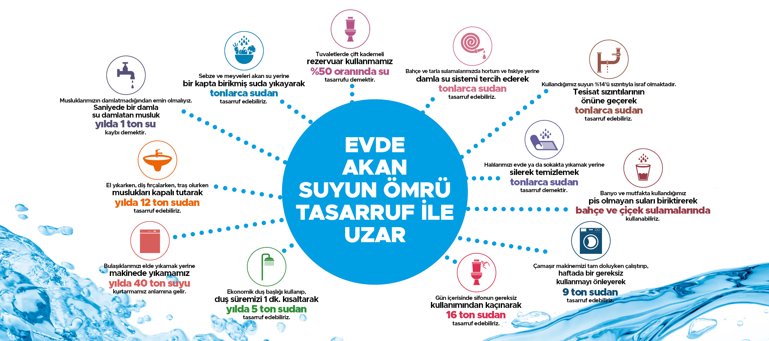 Kaynaklarımızı bilinçli kullanmak, suyumuzu boşa harcamamak adına alınacak tedbirlerin en önemlisi elbette ki tasarruf... Bunun için;