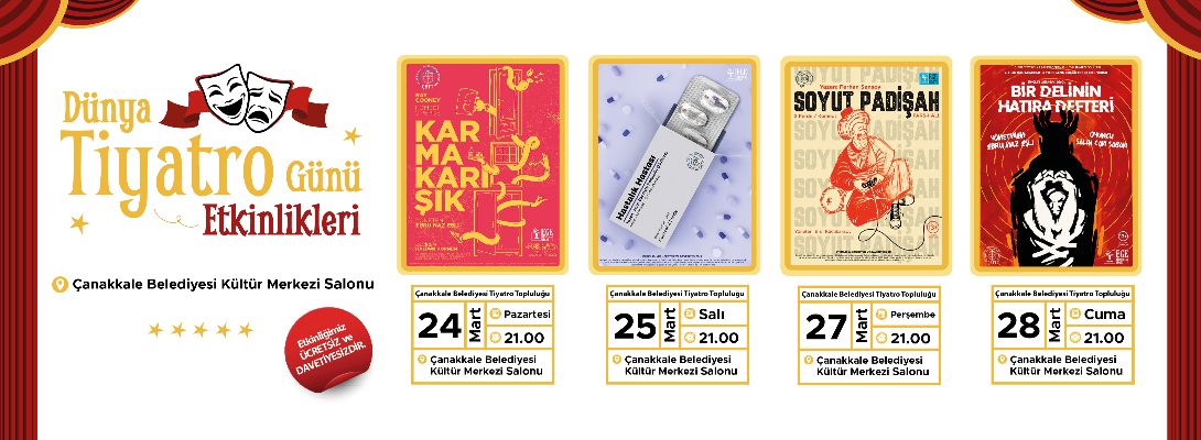 Çanakkale Belediyesi Tiyatro Topluluğu tarafından Dünya Tiyatrolar Günü kapsamında sahnelenecek birbirinden keyifli oyunlara davetlisiniz.