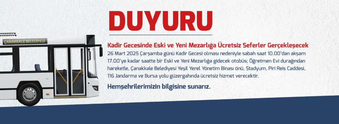 26 Mart 2025 Çarşamba günü Kadir Gecesi olması nedeniyle sabah saat 10.00’dan akşam 17.00’ye kadar saatte bir Eski ve Yeni Mezarlığa gidecek otobüs; Öğretmen Evi durağından hareketle, Çanakkale Belediyesi Yeşil Yerel Yönetim Binası önü, Stadyum, Piri Reis Caddesi, 116 Jandarma ve Bursa yolu güzergahında ücretsiz hizmet verecektir.