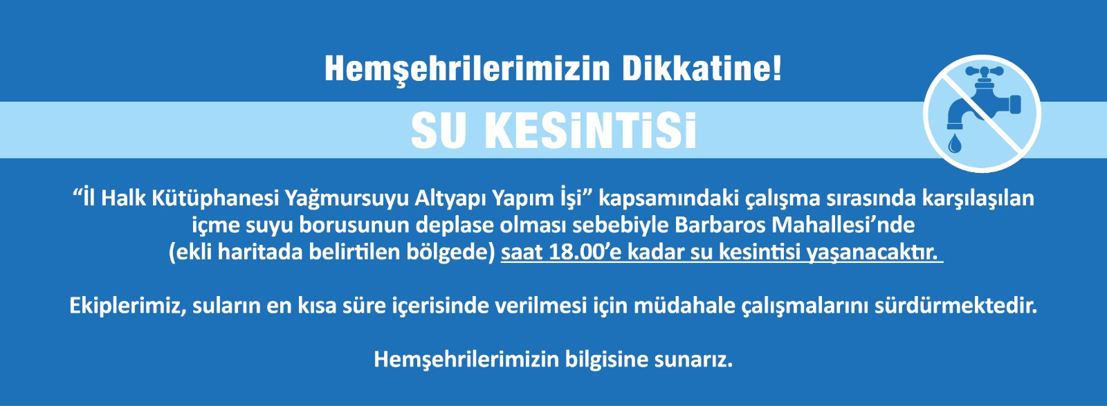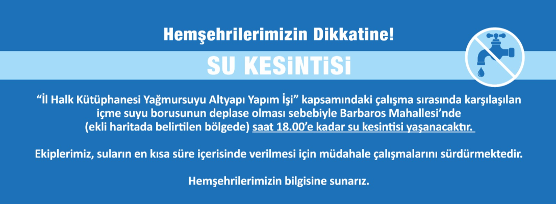 (ekli haritada belirtilen bölgede) saat 18.00’e kadar su kesintisi yaşanacaktır.