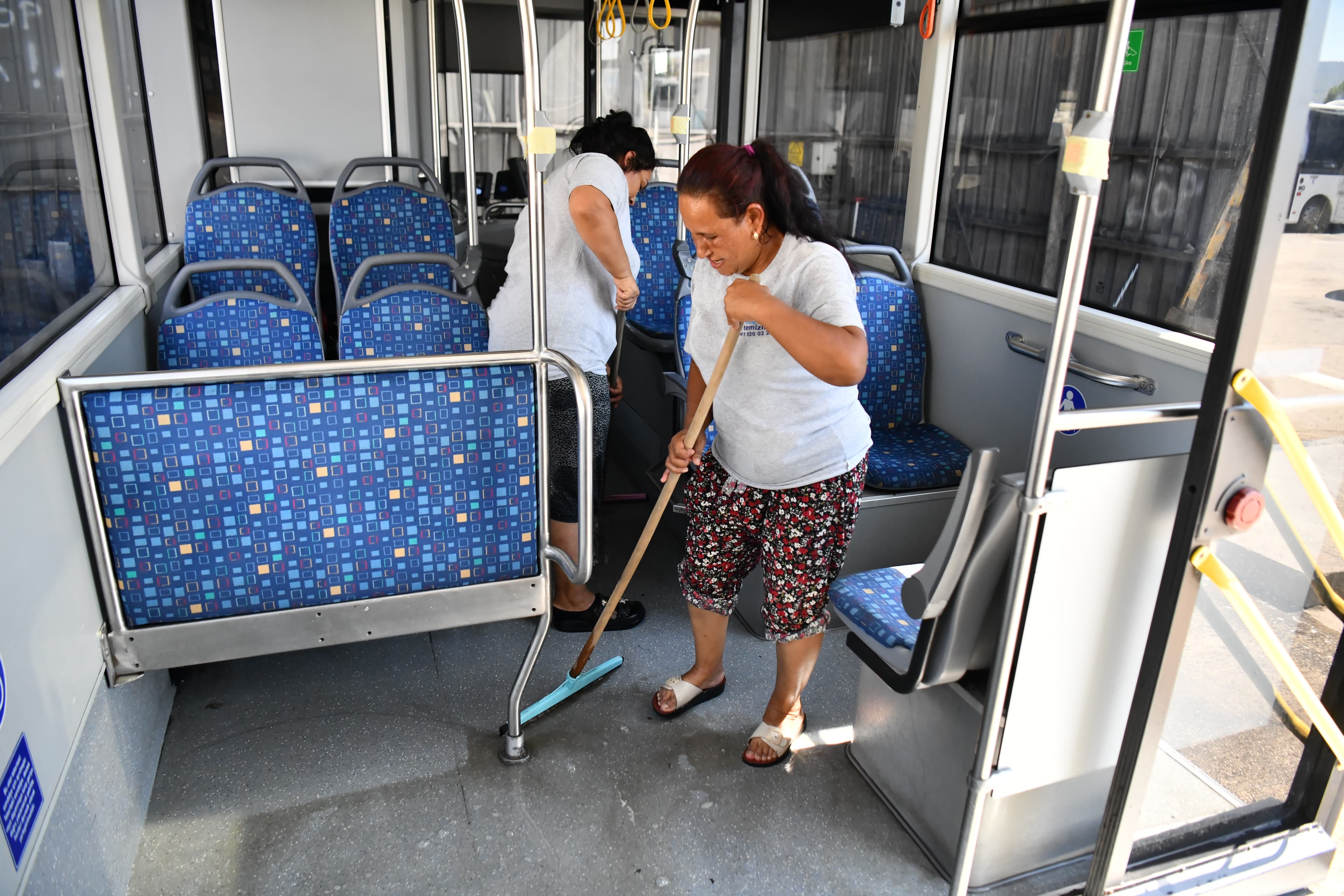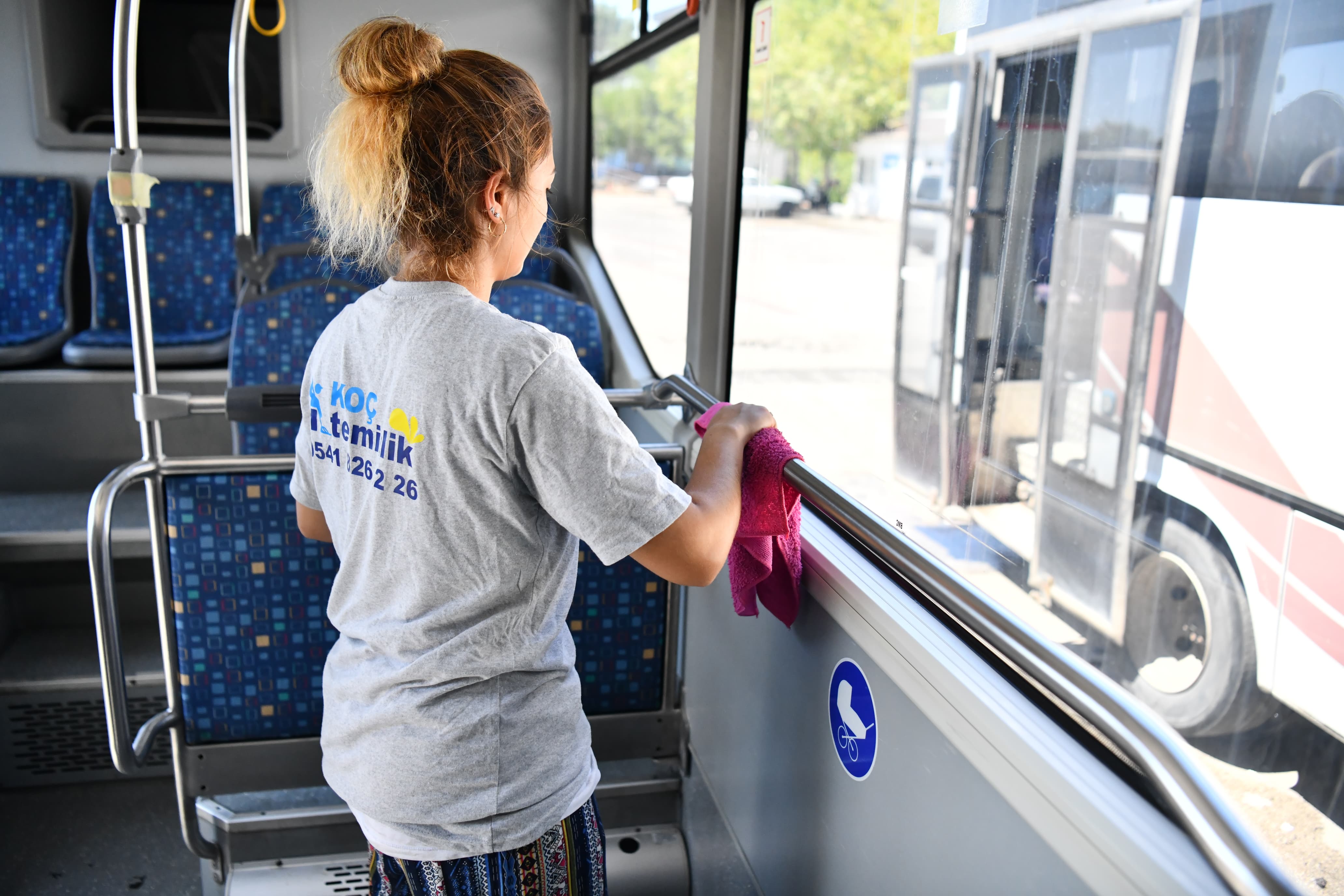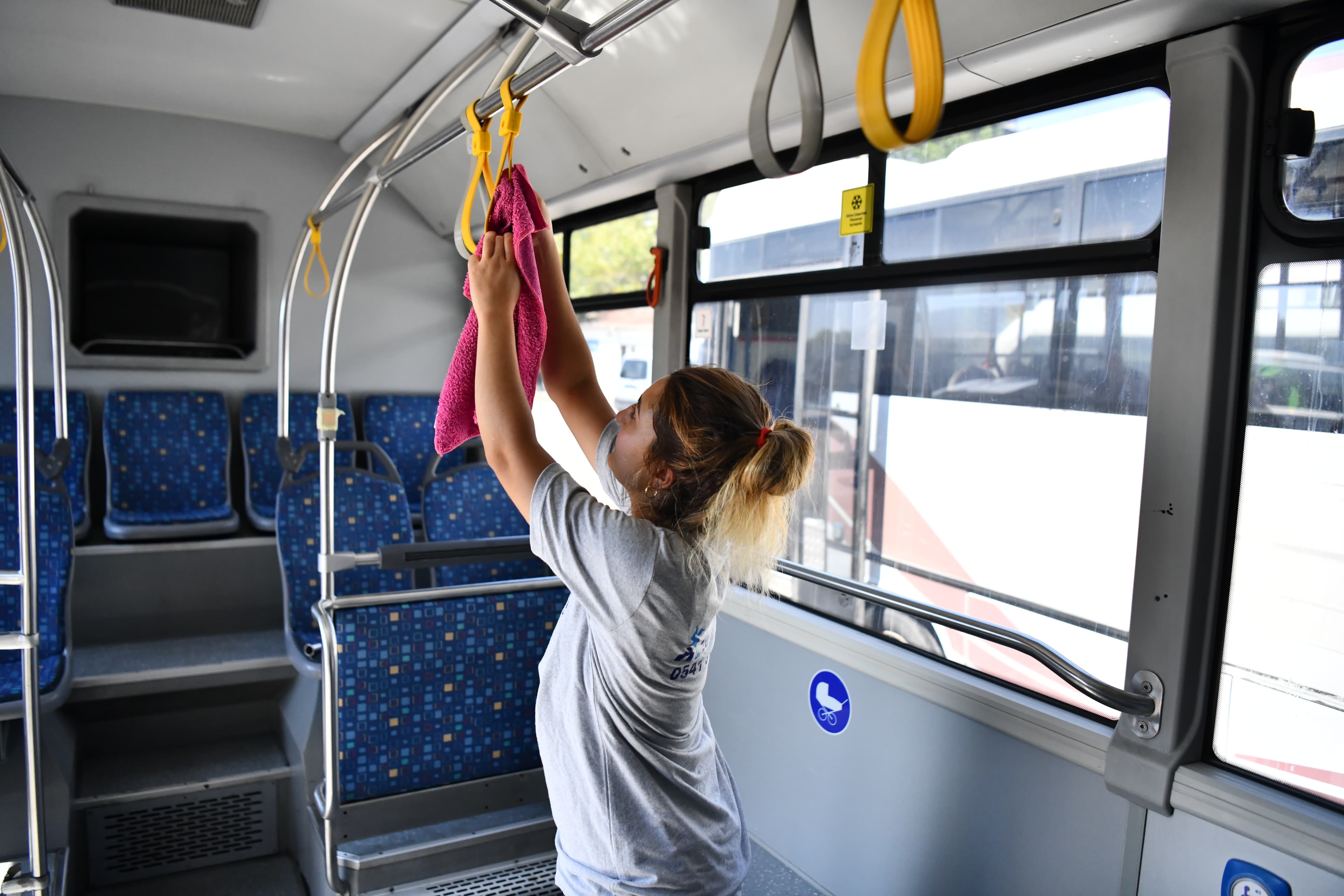Hemşehrilerimizin daha hijyenik ve temiz araçlarda kent içi ulaşımını sağlayabilmeleri amacı ile toplu taşıma araçlarında düzenlenen rutin temizlik çalışmaları devam ediyor. Araç içlerinde gerçekleştirilen detaylı temizlik çalışması kapsamında oturma alanları yıkanırken sürücü kabinleri, tutamaklar, inme butonları, yolcu koltuk tutamakları da silinerek temizleniyor. Öte yandan zeminler ve camlar da köpüklü sular ile yıkanıyor.