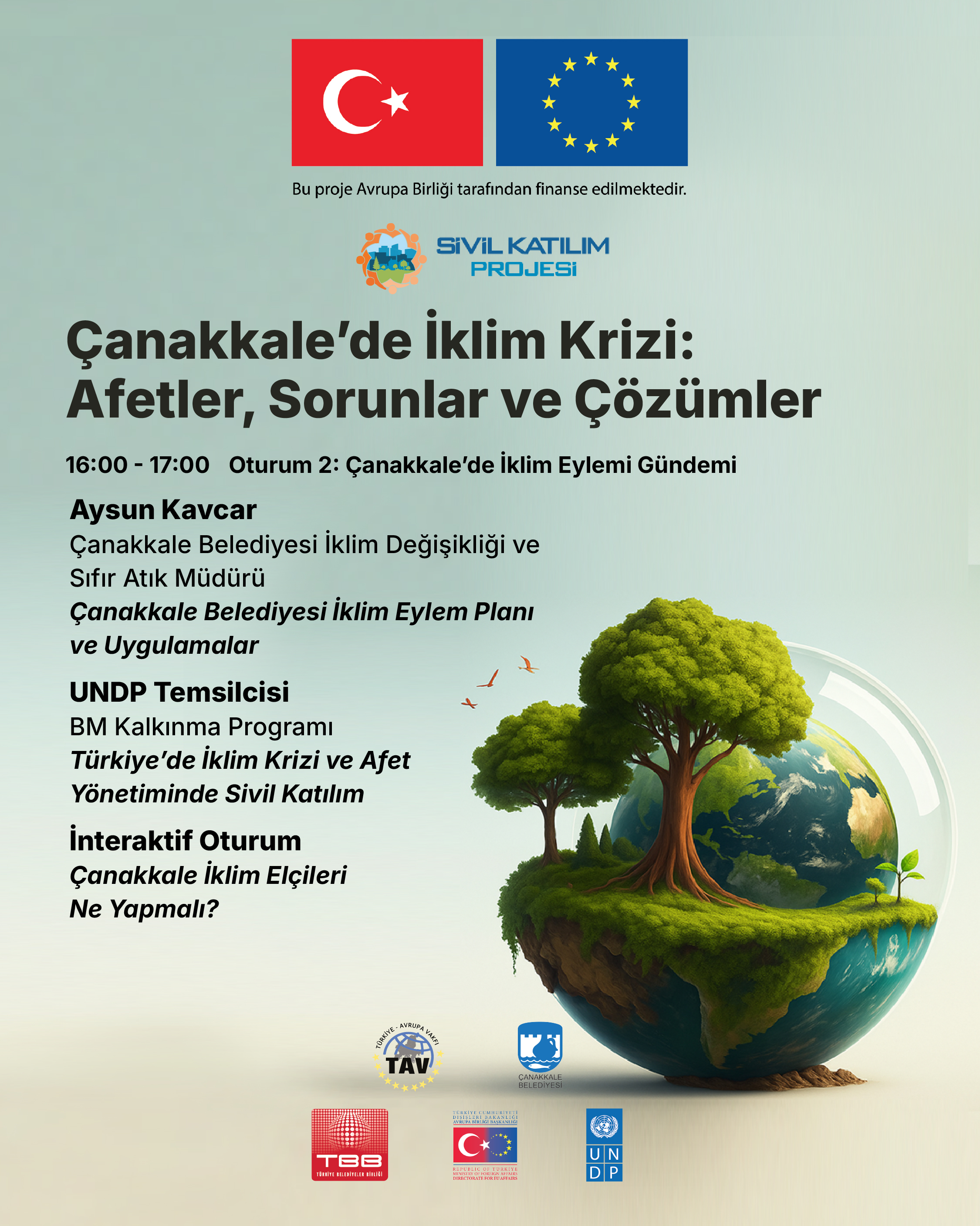 Çanakkale'de, iklim değişikliği ile ilgili politikaların (İklim Eylem Planı) uygulanması ve izlenmesinde sivil toplumun ve hemşehrilerin katılımını sağlamak, güçlendirmek ve sürdürülebilir kılmak amacıyla, Birleşmiş Milletler Kalkınma Programı (UNDP) tarafından desteklenen, Türkiye Avrupa Vakfı ve Belediyemiz ortaklığında yürütülen “Bir Katılımcı ve Kapsayıcı İklim Eylem Modeli: Çanakkale İklim Eylem Grubu ve İklim Elçileri” projesi kapsamında "Çanakkale'de İklim Krizi: Afetler, Sorunlar ve Çözümler" başlıklı panel gerçekleşecek.