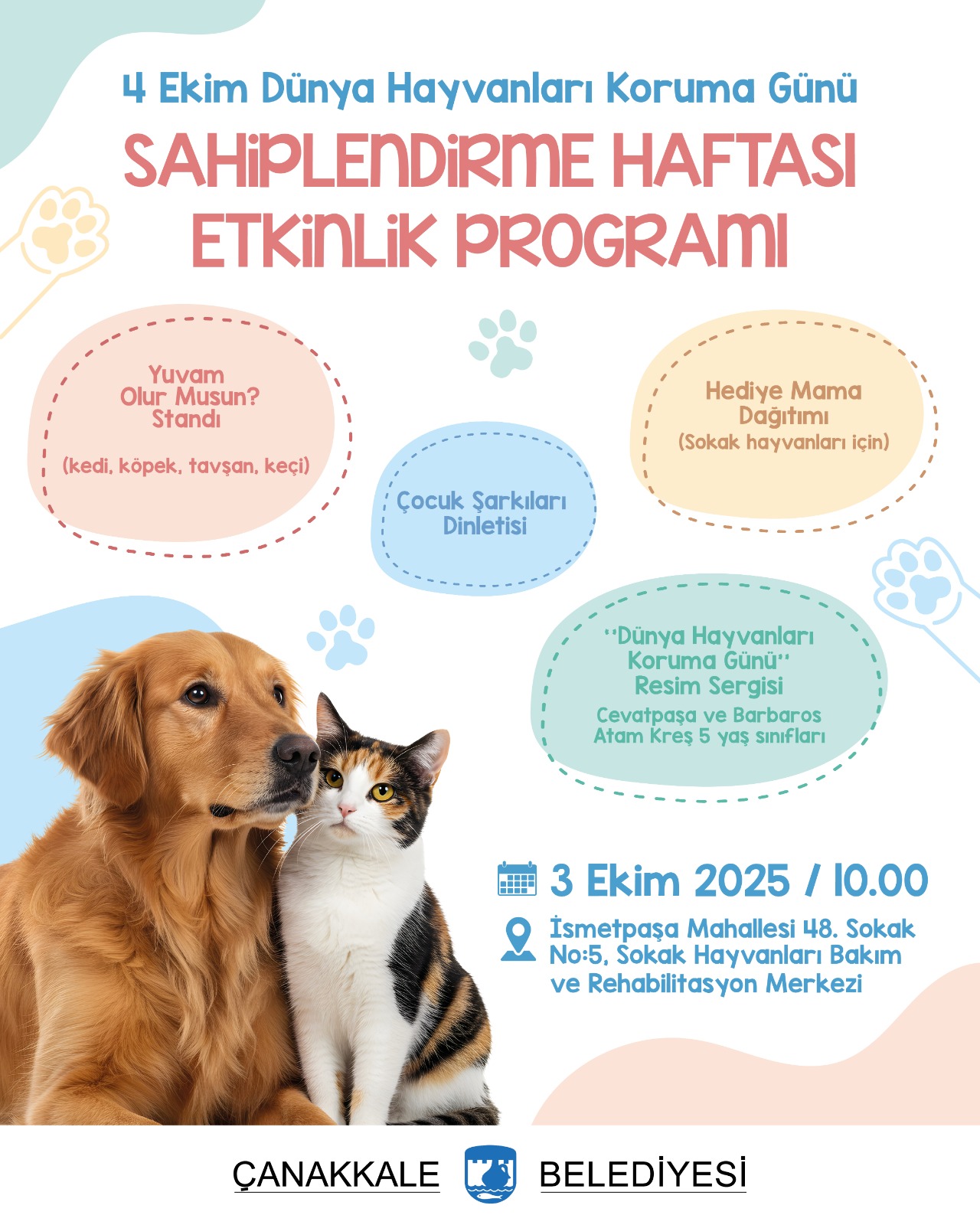 4 Ekim Dünya Hayvanları Koruma Günü Sahiplendirme Haftası kapsamında düzenlenecek etkinlik programı kapsamında; “Yuvam Olur musun? Standı, Çocuk Şarkıları Dinletisi, Hediye Mama Dağıtımı ile Cevatpaşa ve Barbaros Atam Kreş 5 yaş sınıflarının Dünya Hayvanları Koruma Günü Resim Sergisi yer alacak.