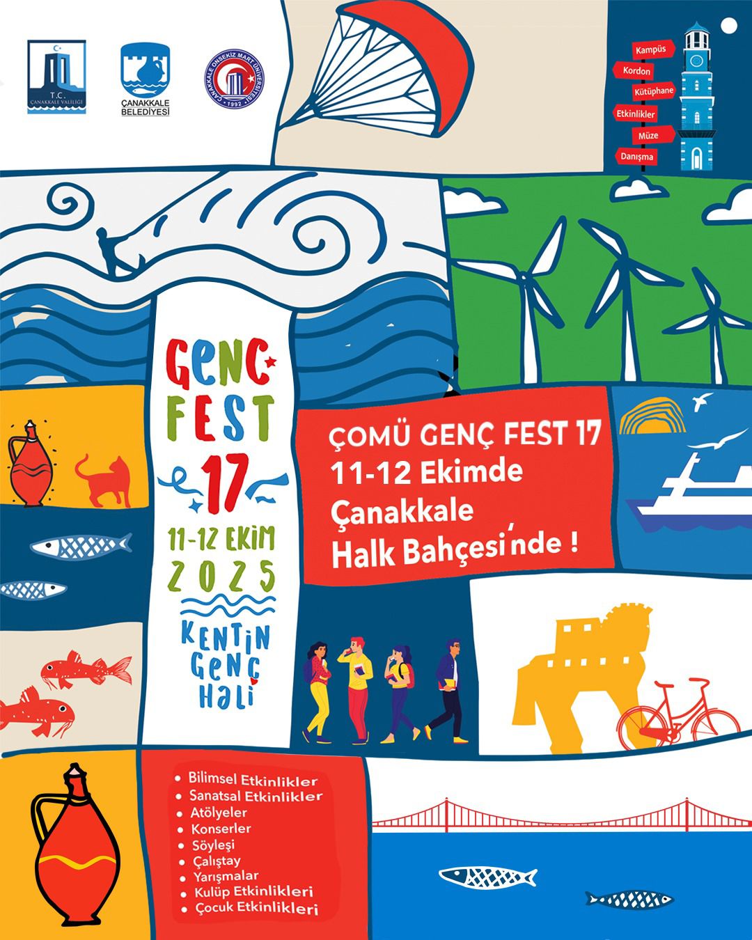 Çanakkale Valiliği, Çanakkale Belediyesi ve Çanakkale Onsekiz Mart Üniversitesi (ÇOMÜ) iş birliği ile 11-12 Ekim 2025 tarihlerinde Halk Bahçesi'nde Genç Fest'17 etkinliği gerçekleştirilecek.