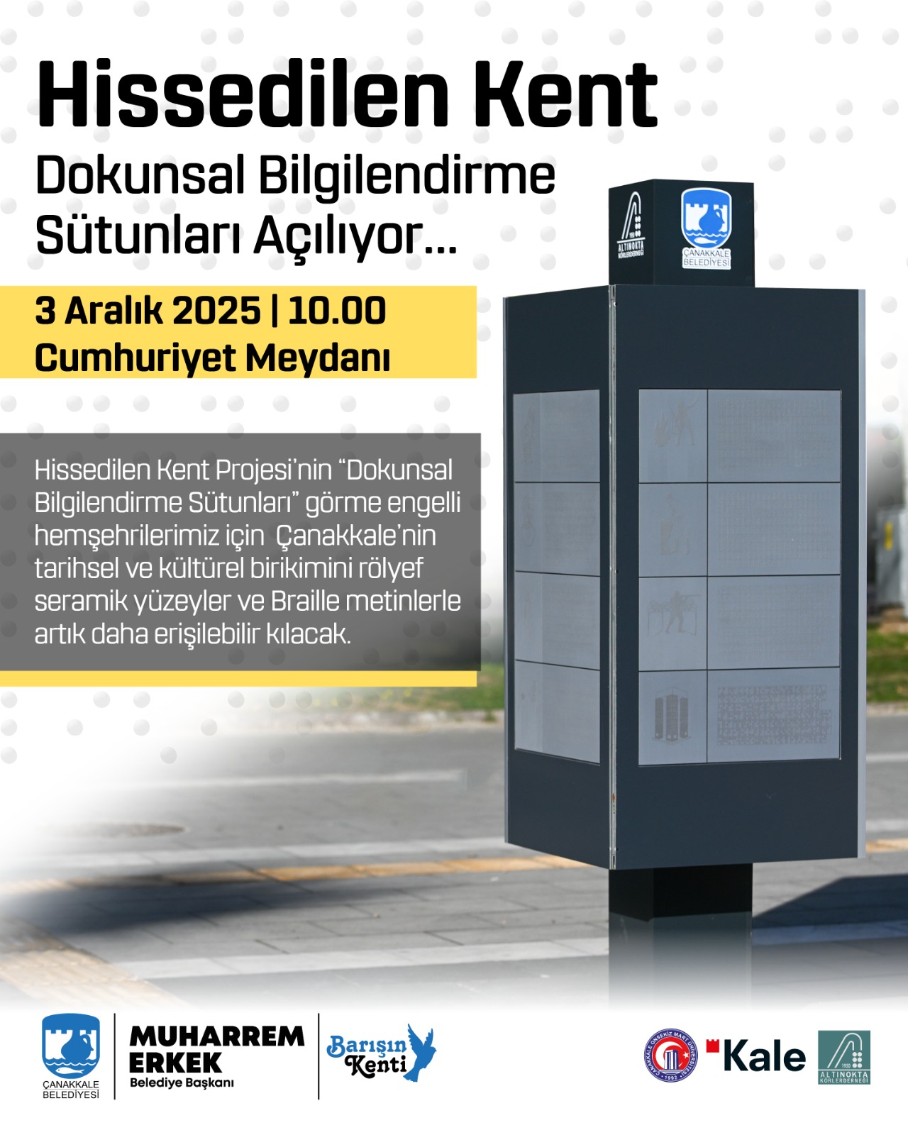 Çanakkale Belediyesi, Çanakkale Onsekiz Mart Üniversitesi (ÇOMÜ), Kaleseramik ve Çanakkale Altı Nokta Körler Derneği iş birliğiyle hayata geçirilen “Hissedilen Kent” projesinin Dokunsal Bilgilendirme Sütunları, 3 Aralık Çarşamba günü açılıyor.