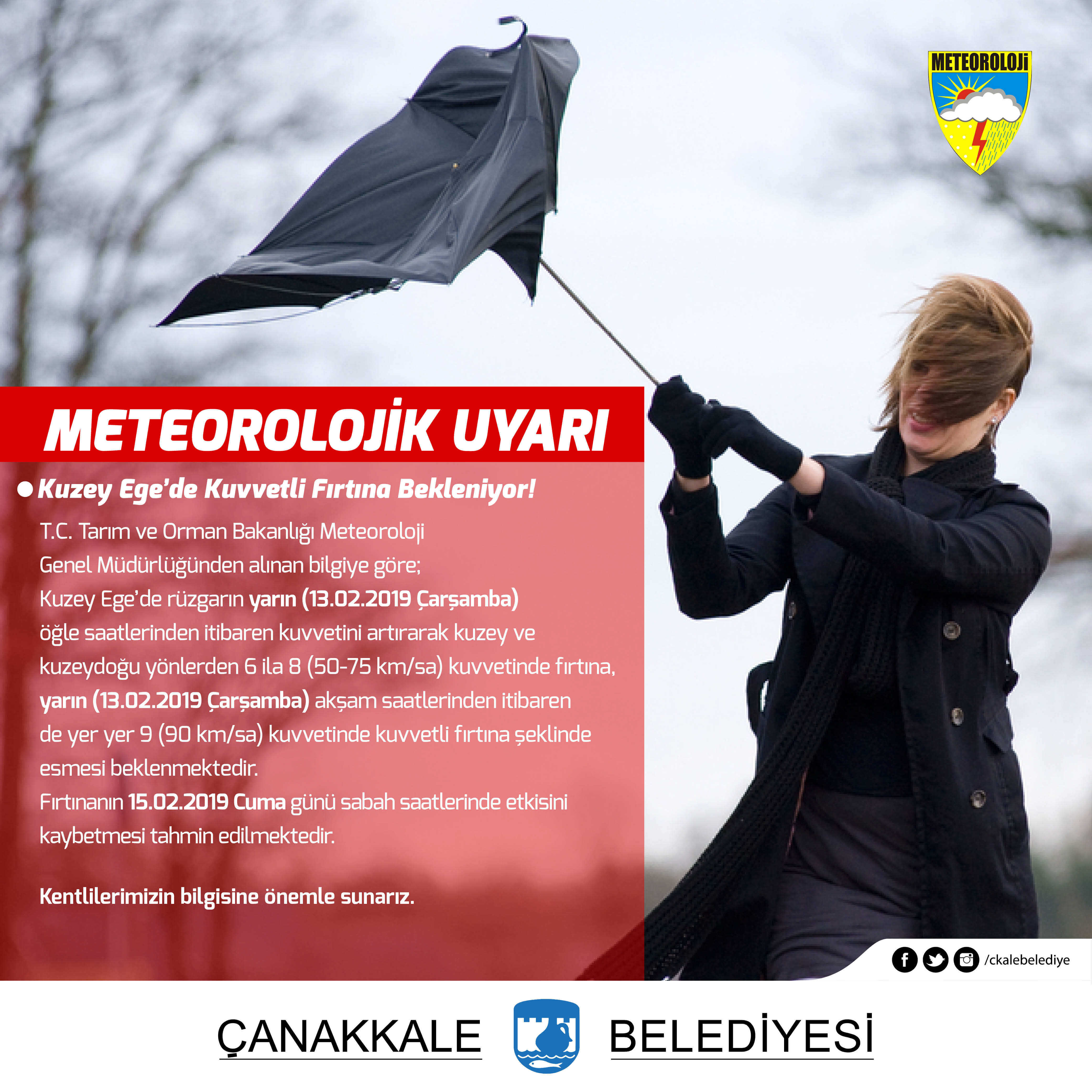 Kuzey Ege'de rüzgarın yarın (13.02.2019 Çarşamba) öğle saatlerinden itibaren kuvvetini artırarak kuzey ve kuzeydoğu yönlerden 6 ila 8 (50-75 km/sa) kuvvetinde fırtına, yarın (13.02.2019 Çarşamba) akşam saatlerinden itibaren de yer yer 9 (90 km/sa) kuvvetinde kuvvetli fırtına şeklinde esmesi beklenmektedir. Fırtınanın 15.02.2019 Cuma günü sabah saatlerinde etkisini kaybetmesi tahmin edilmektedir.