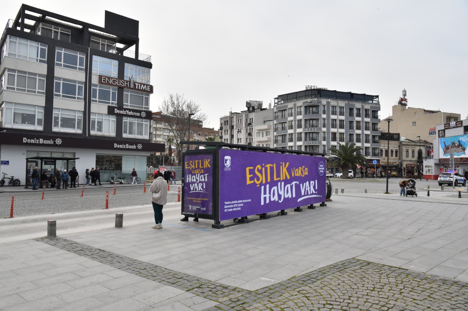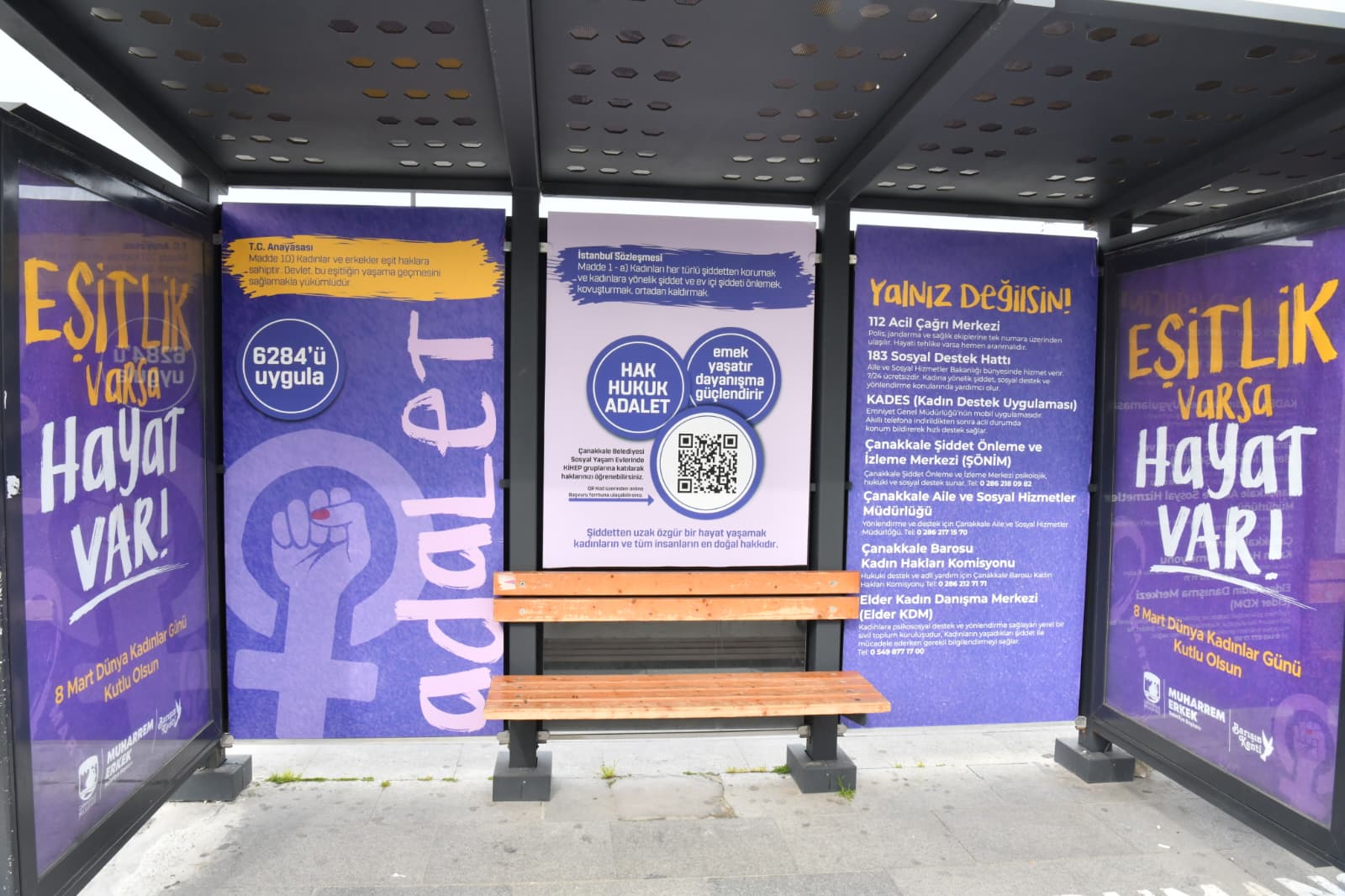 Çanakkale Belediyesi tarafından, 8 Mart Dünya Kadınlar Günü kapsamında kadına yönelik şiddetle mücadeleye dikkat çekmek amacıyla İskele Meydanı'nda yer alan otobüs durağı “8 Mart Farkındalık Durağı” olarak düzenlendi.