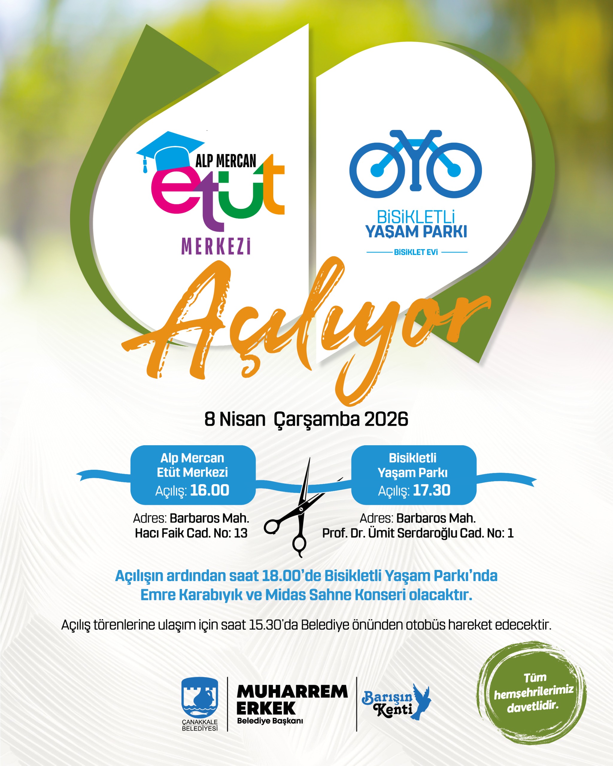 Çanakkale Belediyesinin sosyal belediyecilik anlayışıyla hayata geçirdiği Alp Mercan Etüt Merkezi ile Bisikletli Yaşam Parkı ve Bisiklet Evi, 8 Nisan 2026 Çarşamba günü düzenlenecek programlarla hemşehrilerimizin hizmetine sunulacak.