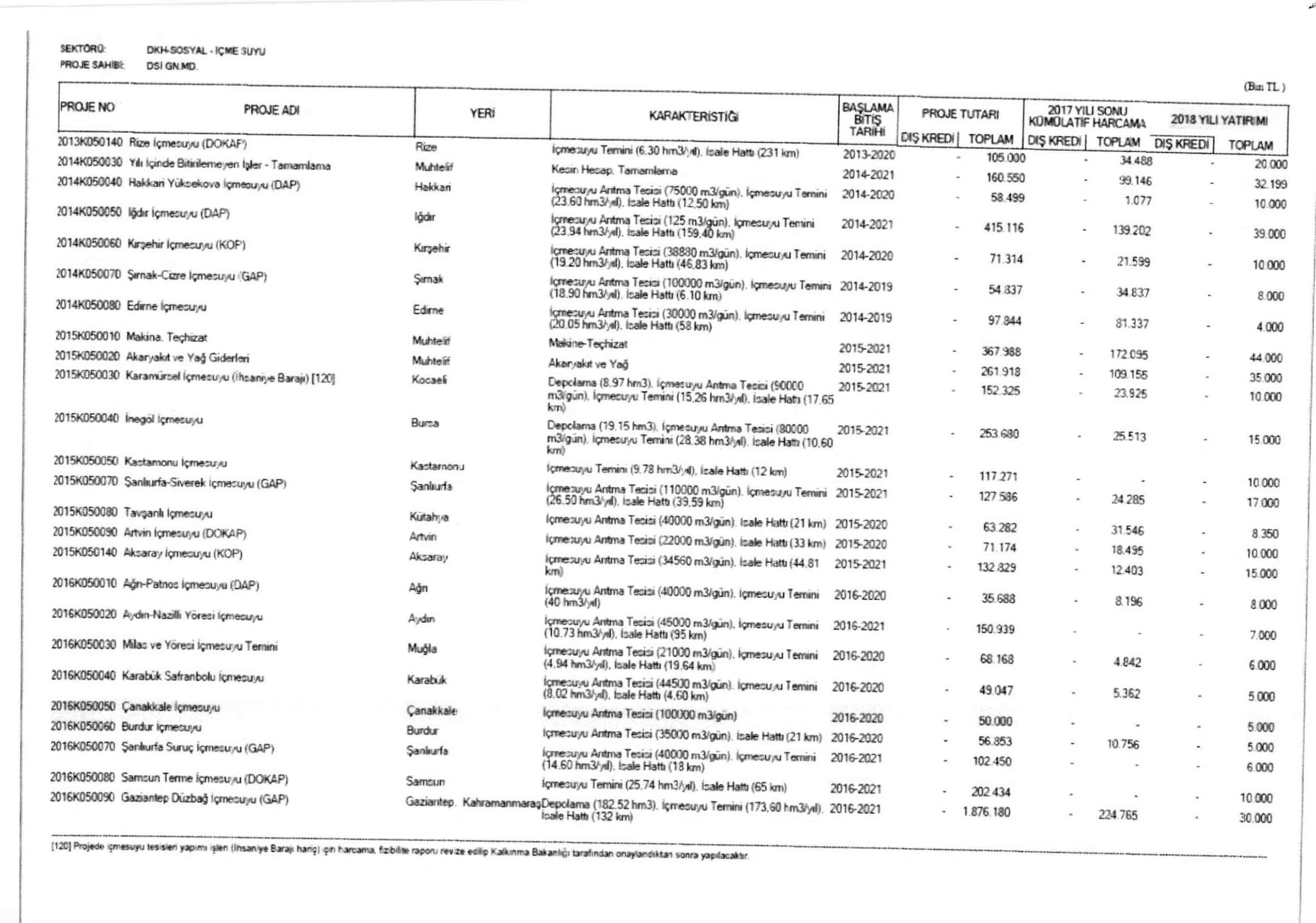 İçmesuyu 2. Kademe Arıtma Tesisi işi için, DSİ 2018 yılı Mal ve Hizmet alımı, Cari Transfer, Sermaye (Yatırım+Kamulaştırma) giderleri ve uygulama planında görüldüğü üzere; 2016K050050 proje nolu Çanakkale İçmesuyu 2. Kademe Arıtma Tesisi için 2018 yılı keşfi için “1TL” 2018 yılı nakdi “1TL” olarak yer almıştır ve 34.723.000 toplam İhale bedelli iş için 2019 ve sonrası keşif bedeli olarak 34.722.999 TL olarak yer almıştır. (Ek-2)