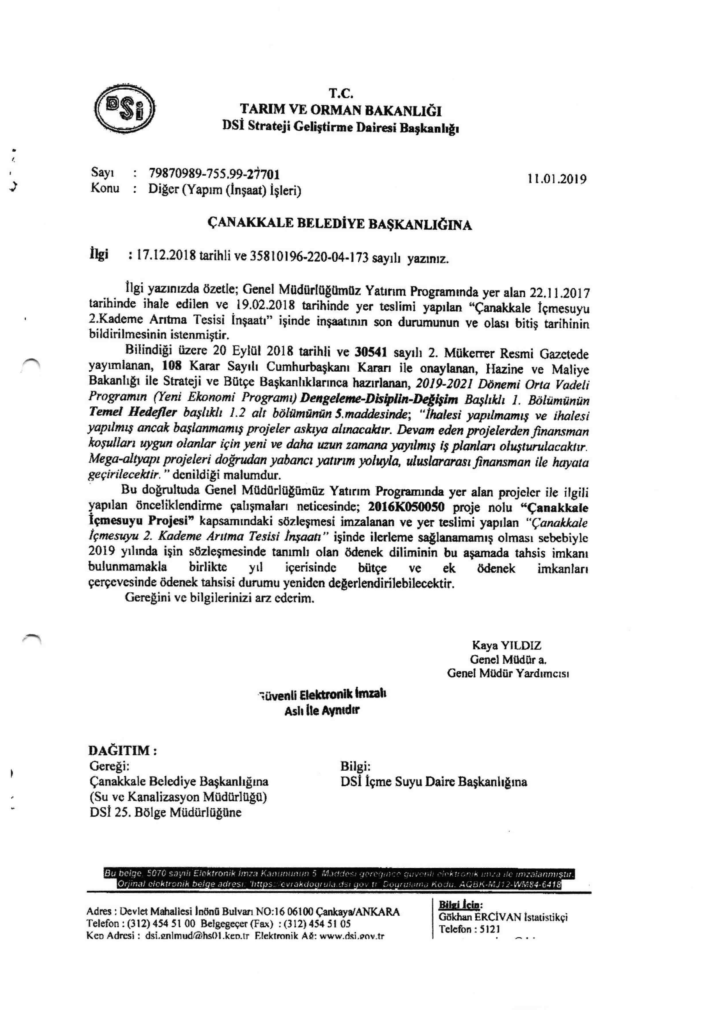 Bu doğrultuda DSİ Genel Müdürlüğünce Yatırım Programında yer alan projelerle ilgili yapılan önceliklendirme çalışmaları neticesinde, ….2016K050050 proje nolu Çanakkale İçmesuyu İnşaatı ile ilgili olarak; 2019 yılında işin sözleşmesinde tanımlı olan ödenek diliminin bu aşamada tahsis imkanı bulunmamakla birlikte yıl içerisinde bütçe ve ek ödenek imkanları çerçevesinde ödenek tahsisi durumu yeniden değerlendirilecektir.” cevabı gelmiştir. (Ek-3)