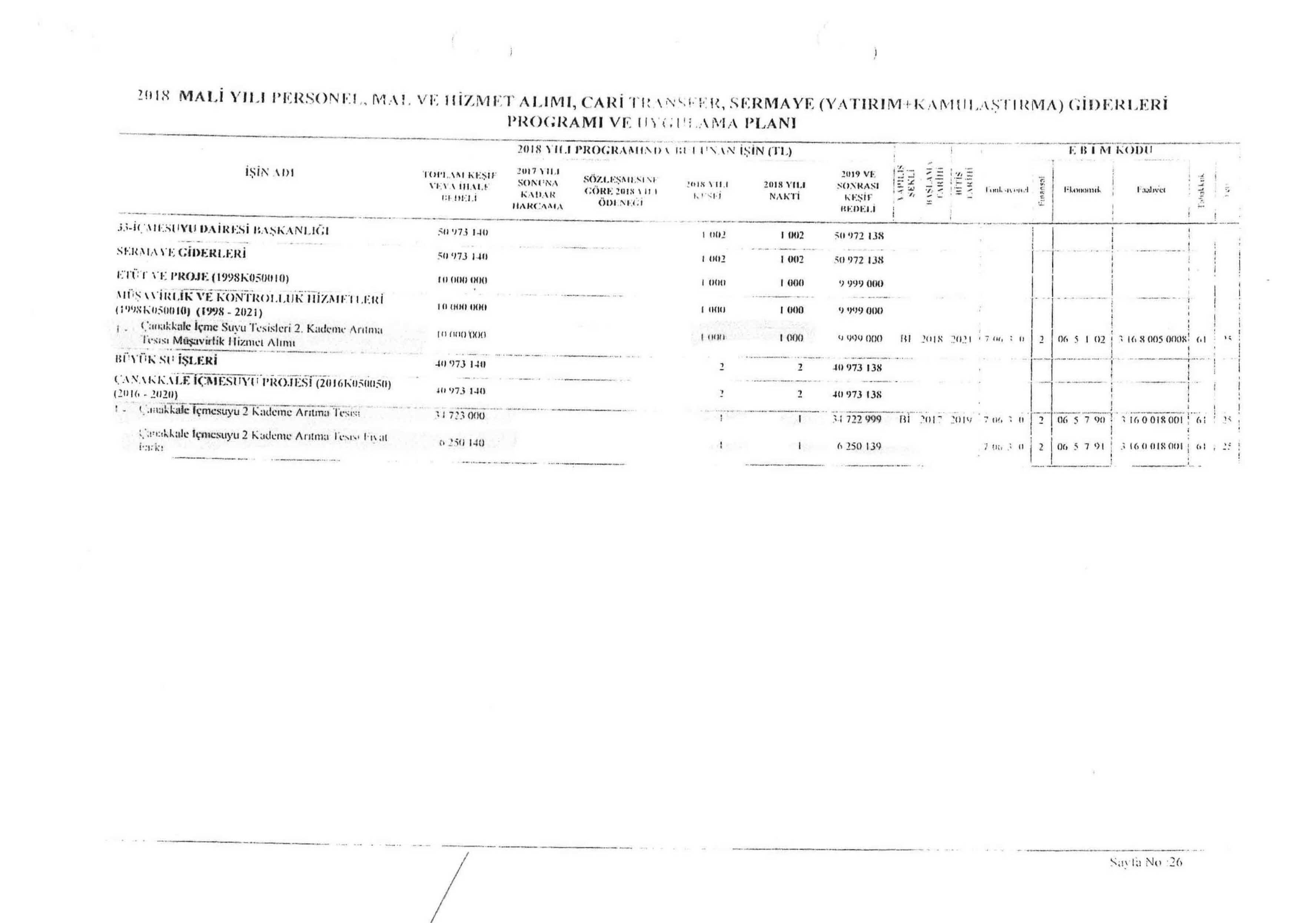 Yer teslimi yapılan 2016K050050 proje nolu Çanakkale İçmesuyu 2. Kademe Arıtma Tesisi işi için ayrılan ödenek 28 Ekim 2017 Tarihli ve 30224 Sayılı Resmî Gazete’de yayımlanan 2018 Yılı programında görülmektedir. (EK-1)